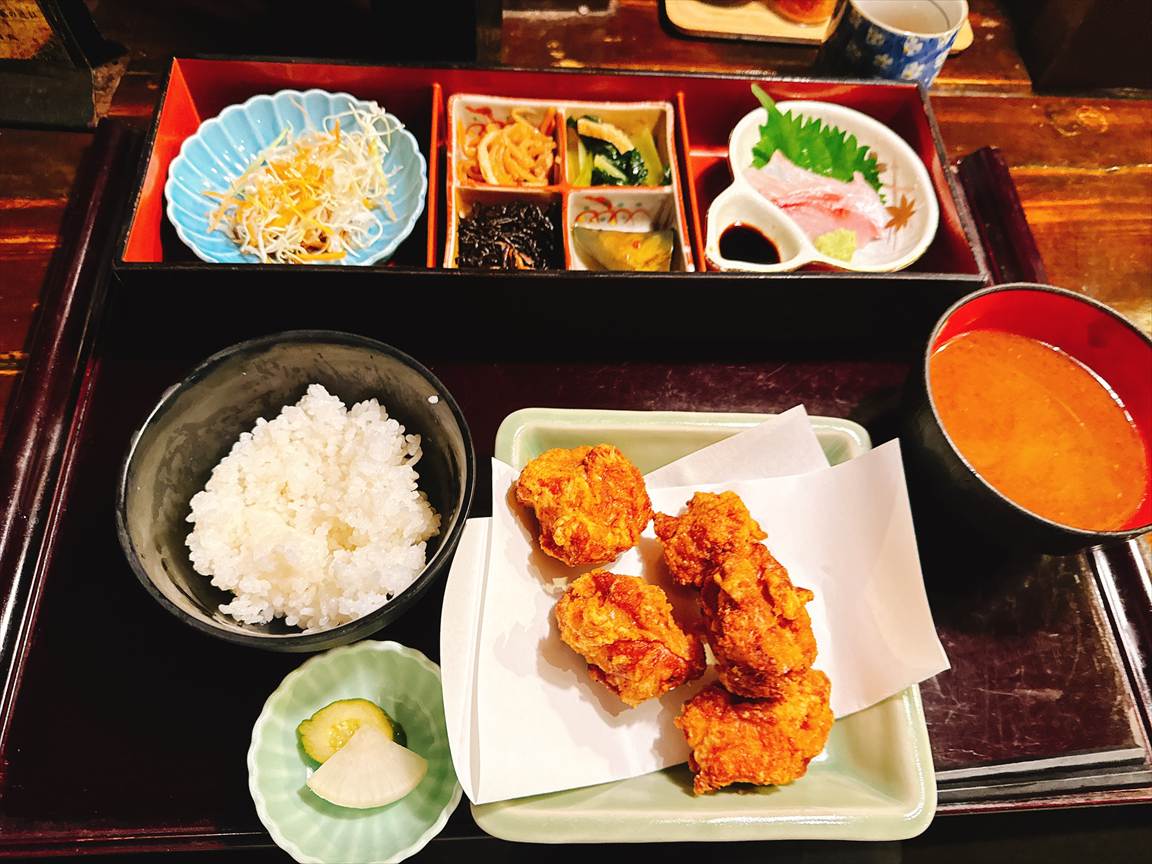 これまで刺身定食や海鮮丼を選んできましたが、迷ったお店の候補に唐揚げが自慢の店があったので居酒屋さんの唐揚に惹かれて、しかも海鮮も外せないので、「から揚げ定食+お刺身3点盛」1300円を注文します。