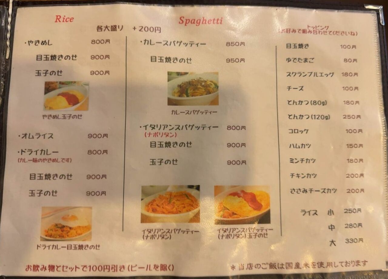焼きめしオムライスにスパゲッティもあります。トッピングのオプションが豊富です。