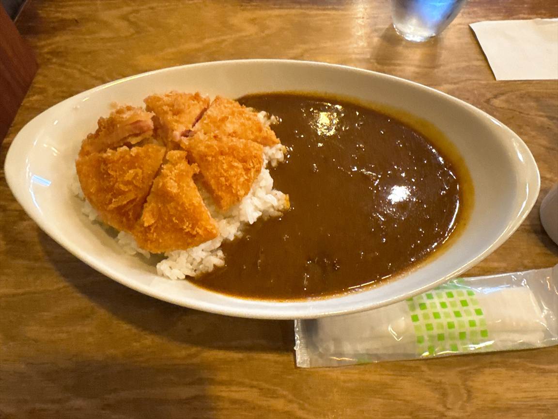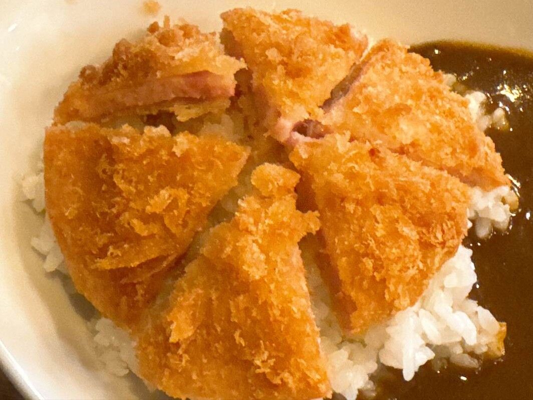 ハムカツは意表を突いてピザ式にカットされています。パン粉が荒く衣がサクサクでハムは適度な厚さで柔らかです。カレーとライスとハムカツが一緒になるとちょうどよいバランスです。