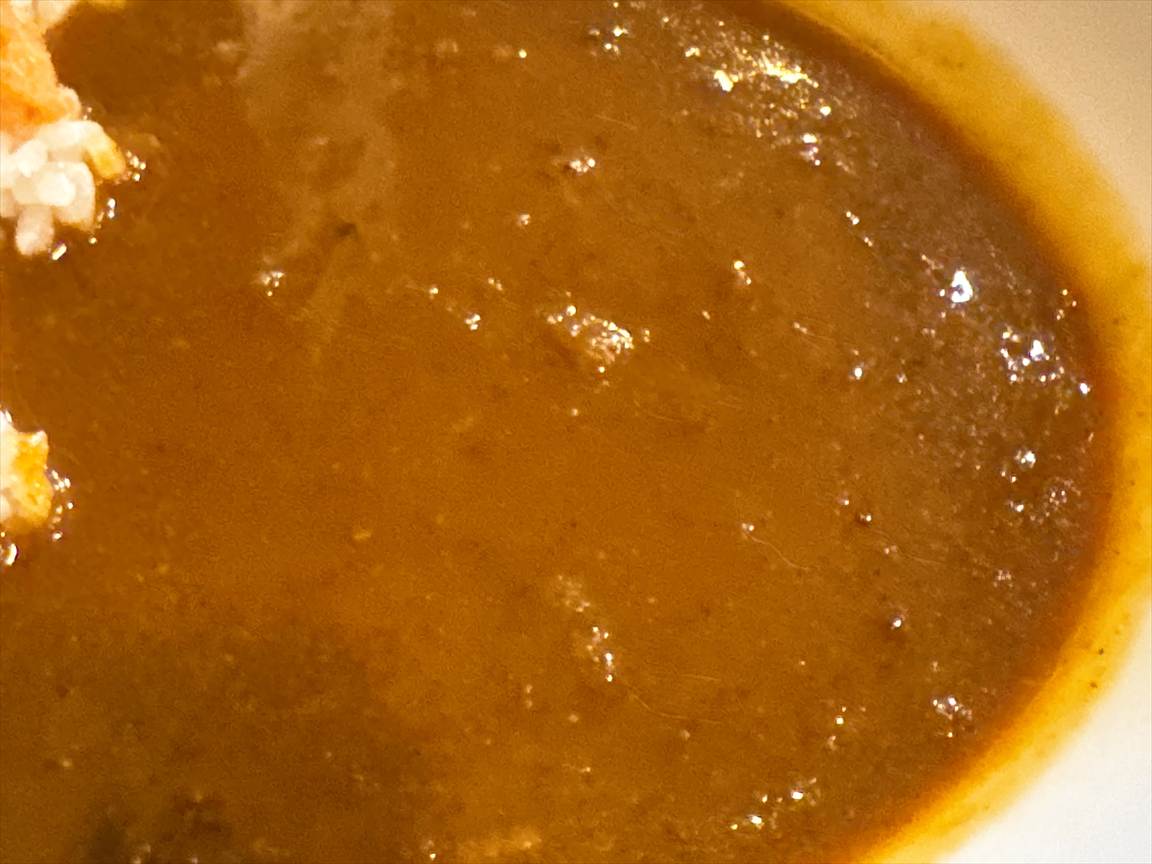 具材が溶け込んだルーは粘度が少ないです。最初フルーティで甘めの味わいでじんわりとカレーの辛さがやってきます。