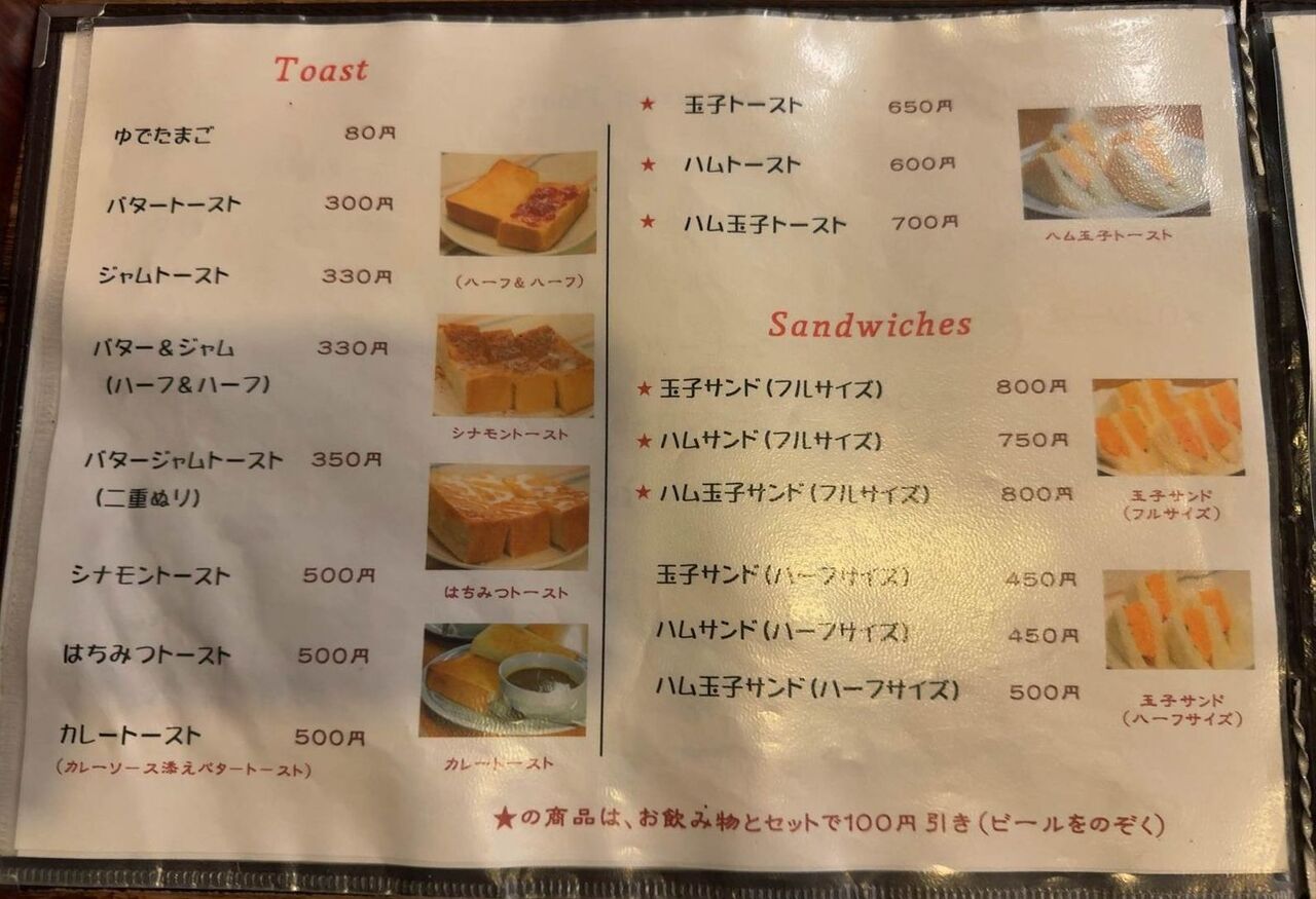 トーストの種類も多いです。人気の玉子サンドはフルサイズとハーフサイズが用意されています。