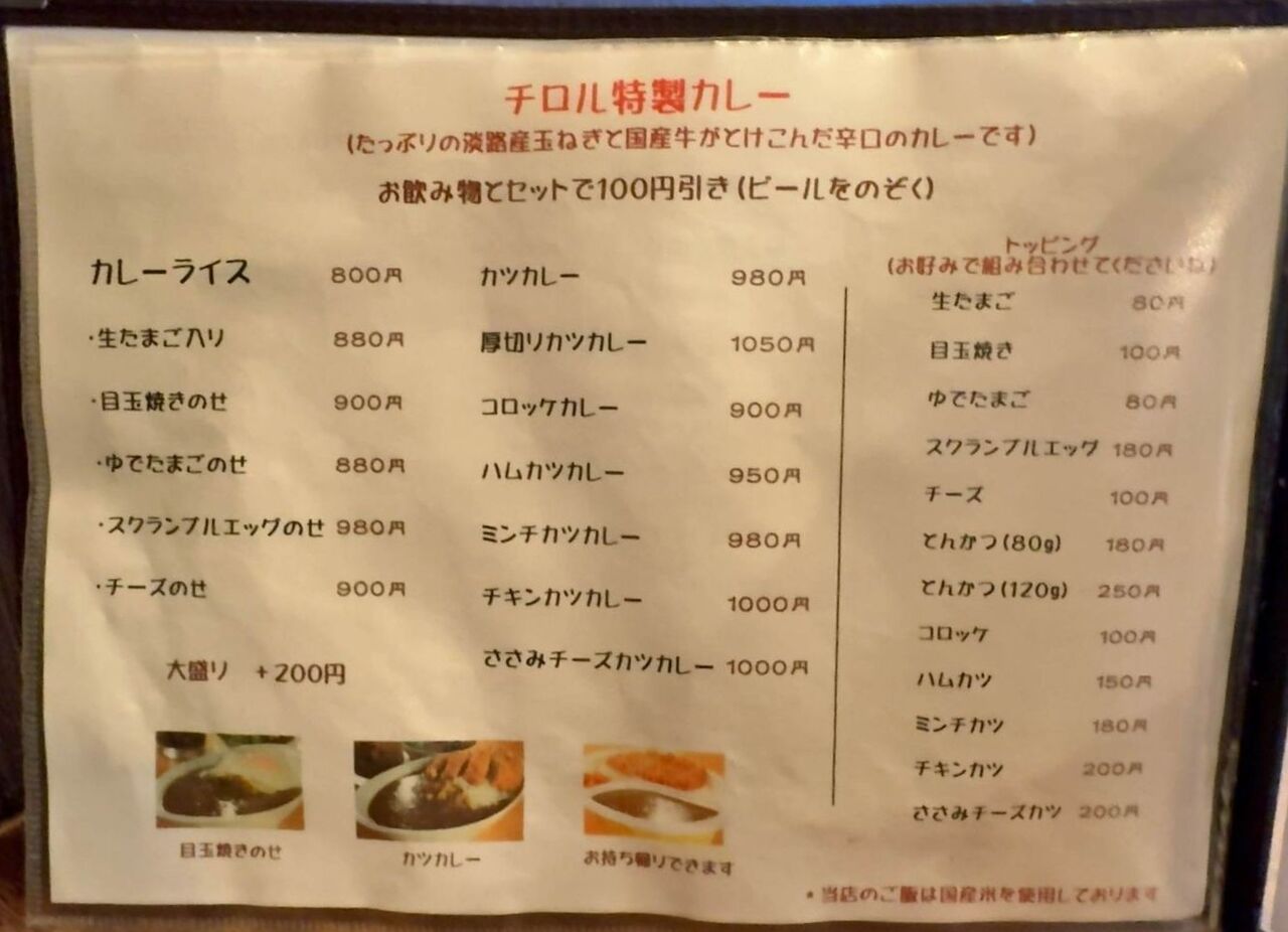 歴史を感じる入り口にカレー、焼きめし、スパゲティとお勧め料理の看板がありますが、小さなテが使われていてレトロな感じです。