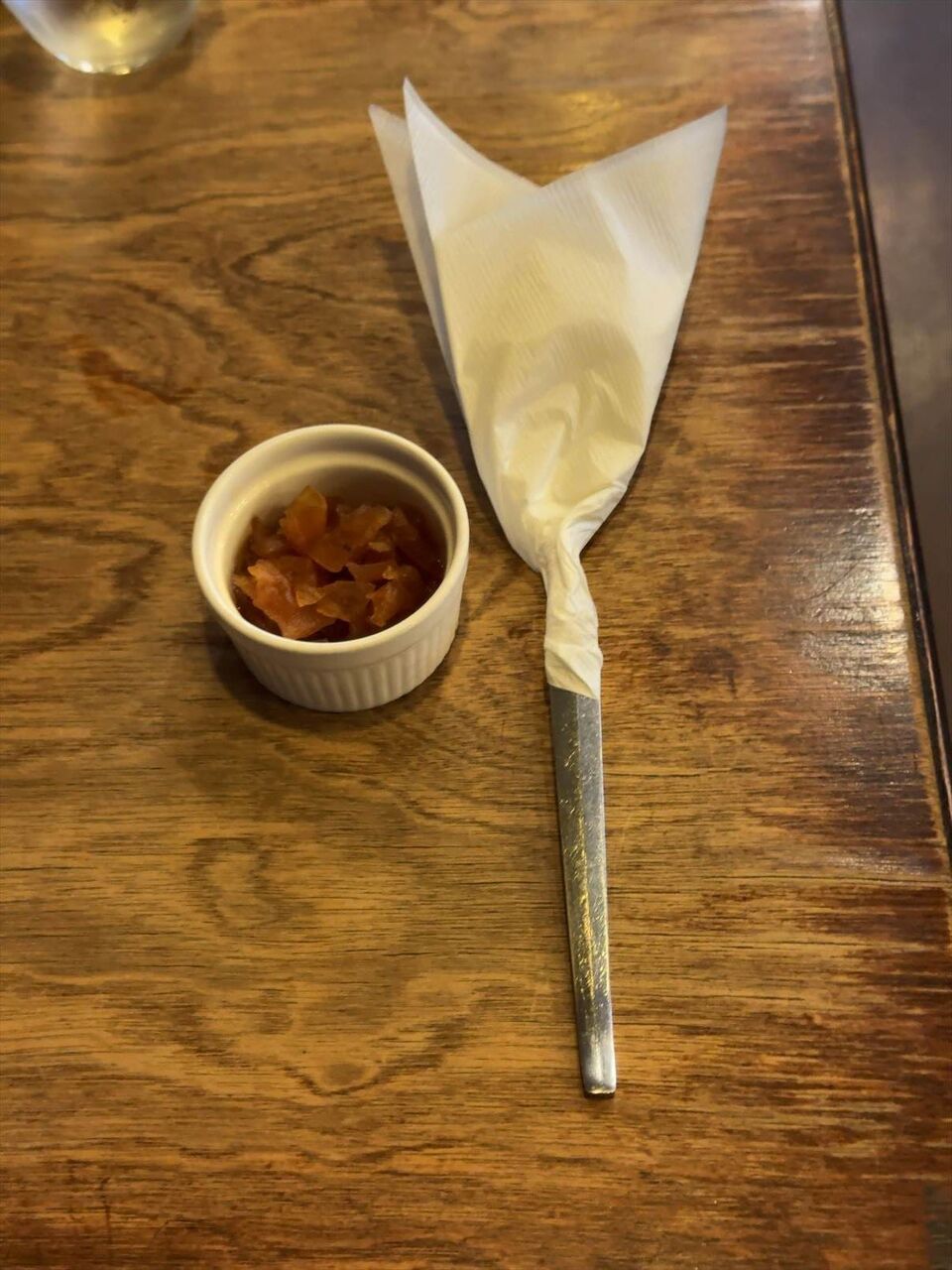 まず三角ナプキンでくるまれたスプーンと福神漬けが出てきます。福神漬けはたくさん入っています。