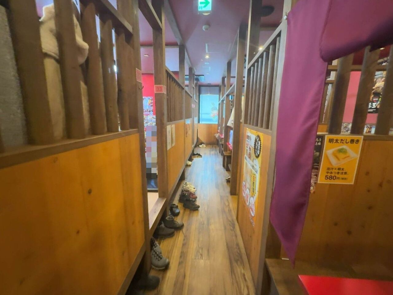 細い通路の両側に個室的に区切られたボックス席や小上がりが並びます。正月で昼からグループでいっぱいです。