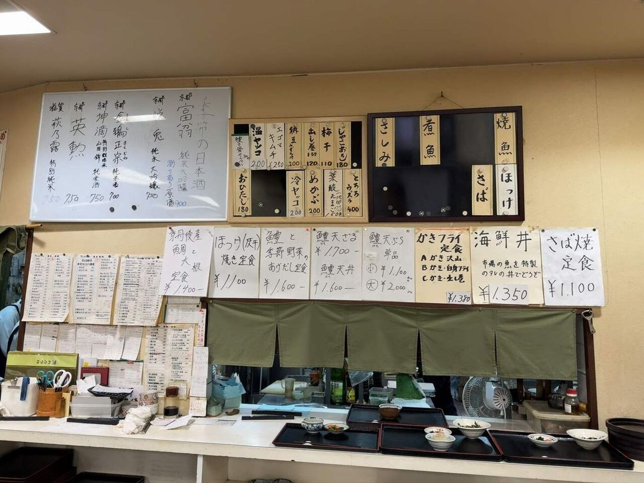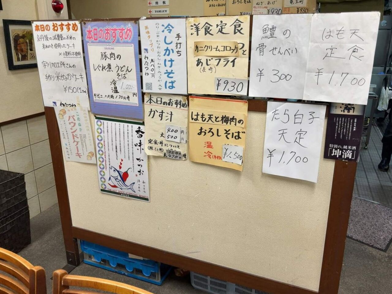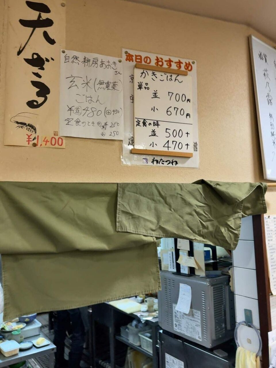 こちらの衝立のメニューは見落としていました。たら白子天定食やかす汁は魅力的です。