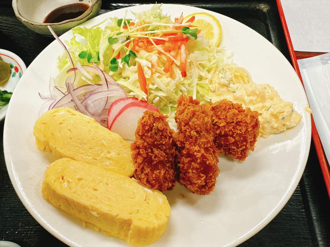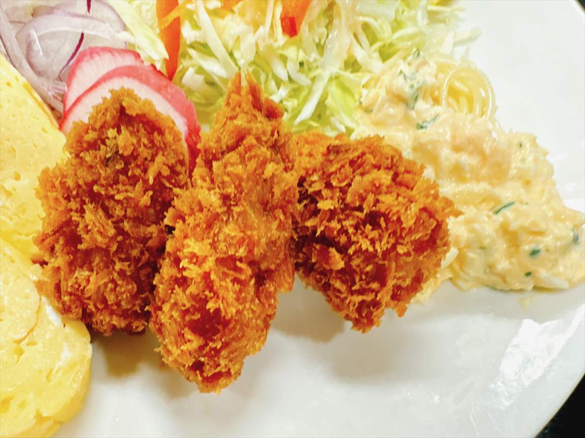 牡蛎フライは小ぶりですが濃厚です。添えられたタルタルは玉子がタップリ入っています。