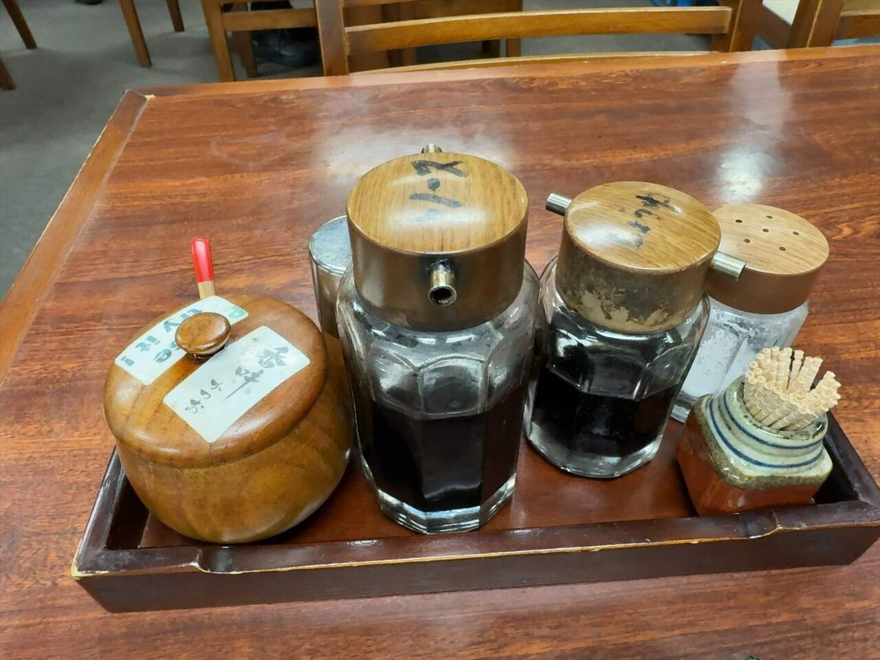 テーブルには調味料が並びますが手書きで種類が書いてあります。