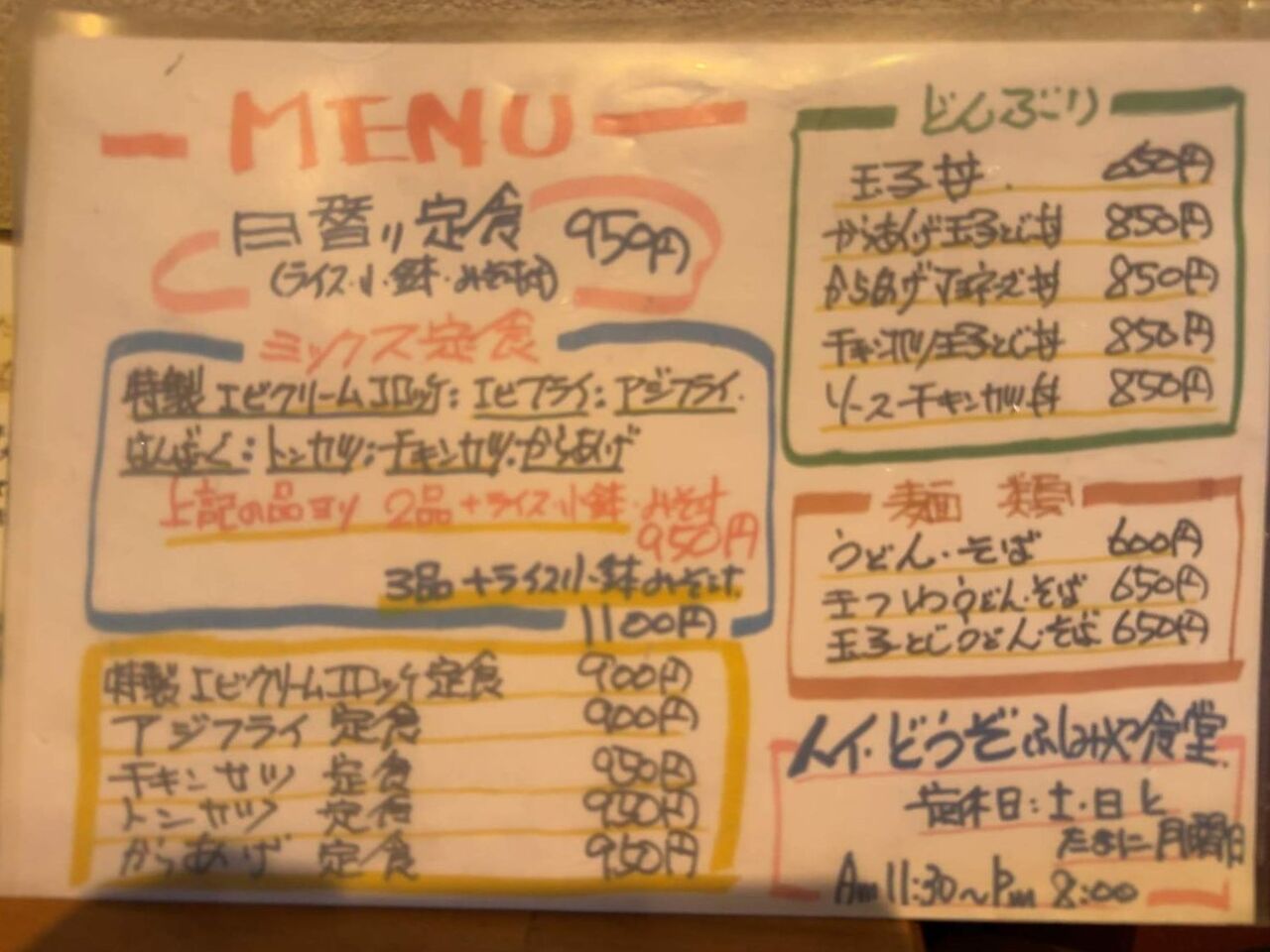 メニューには日替わり定食や揚げ物の定食に丼、麺なんかがあります。
