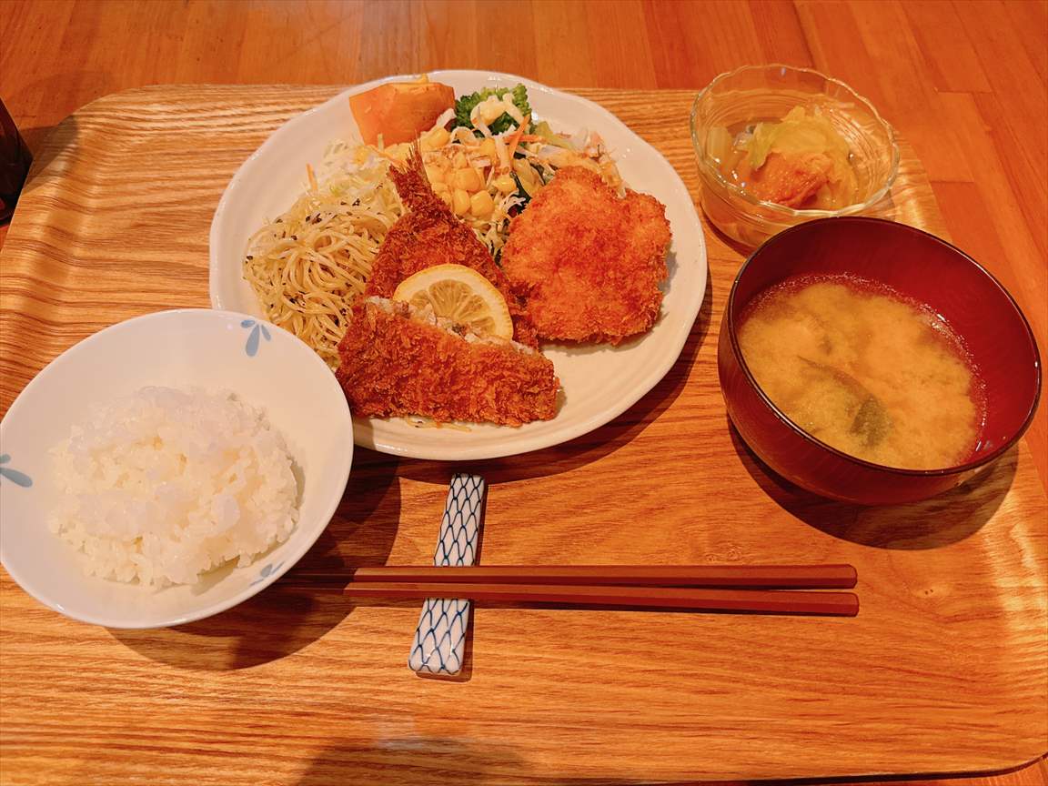 でもスタンダードな定食がほしくて、「ミックスフライ定食(特製エビクリームコロッケ+アジフライ)」950円を注文します。