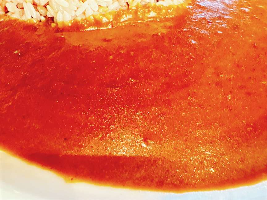 赤っぽいカレーは具がすべて溶け込んでいます。コクがあり口に入れるとスパイスが広がり、辛さは普通ですが食べ進むと跡からじわっと辛さが押しかけてきます。