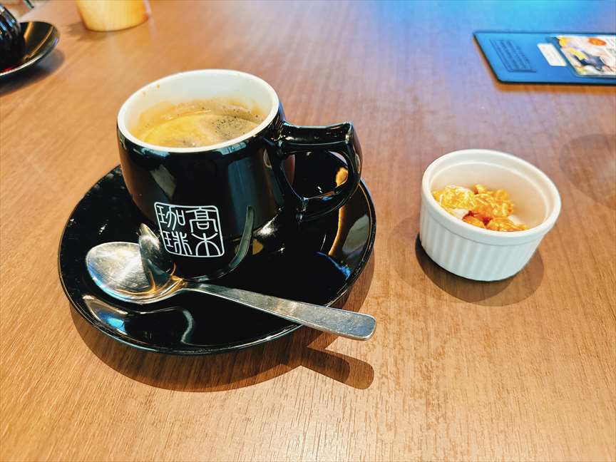 せっかくですので食後に「オリジナルブレンド」451円を注文します。フードとセットですから110円引きになります。豆菓子が付いてきます。