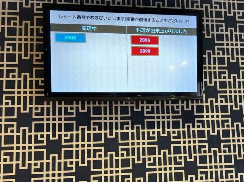 大形ディスプレイに受付中の番号とできあがった番号が表示されます。