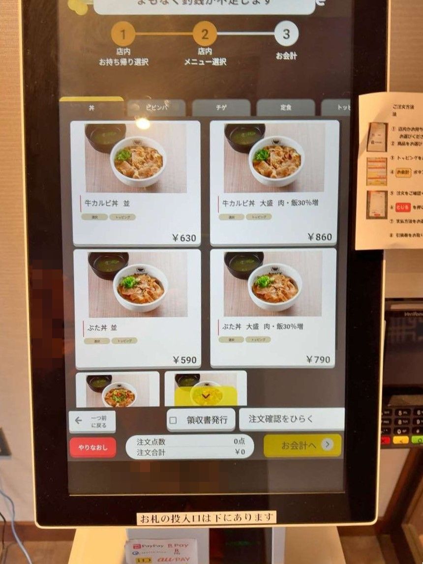 一番スタンダードであろう、「牛カルビ丼並」630円をタッチします。