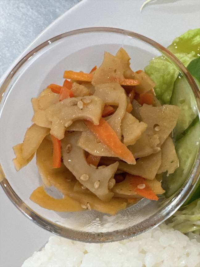 プレートの上に小鉢が乗っています。レンコンと人参のきんぴらはシャキシャキ食感です。