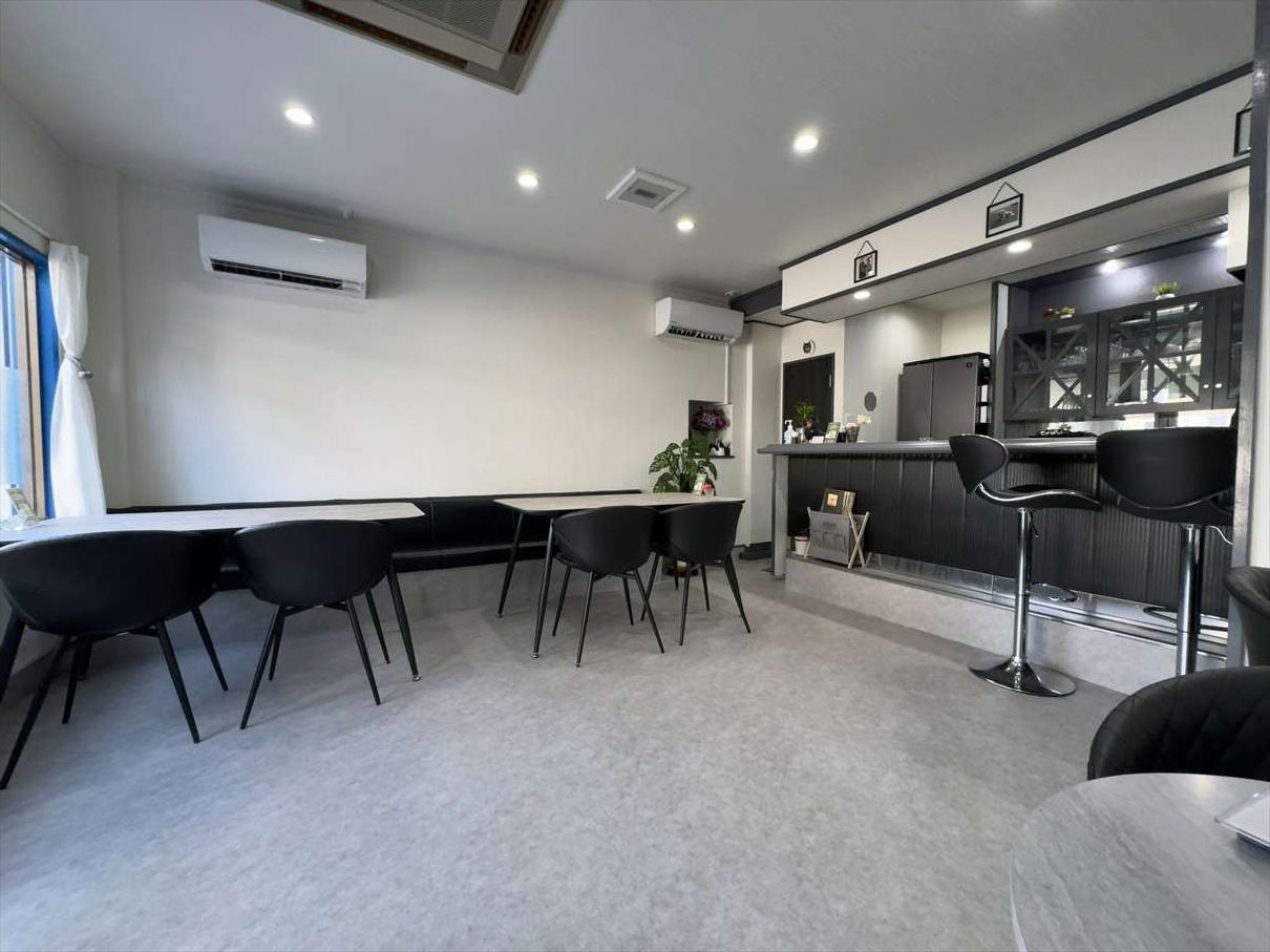 店内は飾りのないシンプルな白黒のモダンなデザインです。スナックのような作りでスツールが高いです。