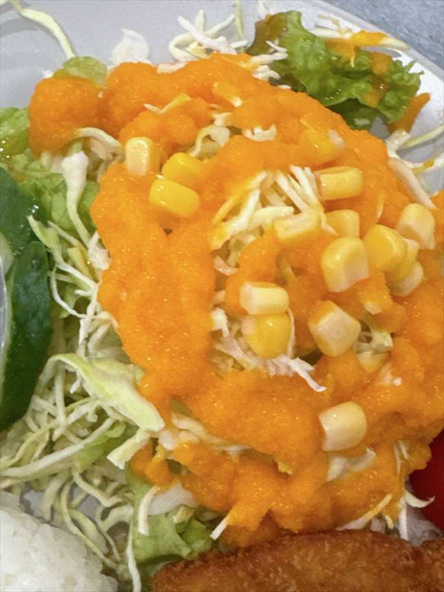 サラダには人参でしょうか自家製ドレッシングがかかっています。みぞれ風で野菜を包み込みます。