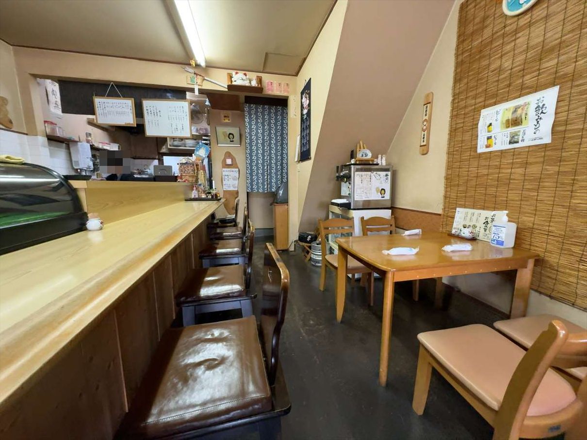 店内はネタケースのあるL字カウンターと壁際にテーブルがあります。