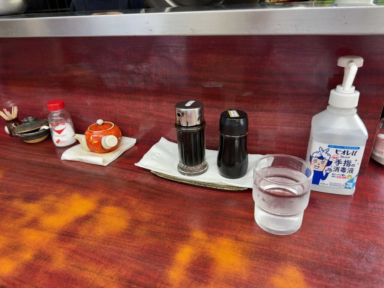 カウンターに調味料が並びます。