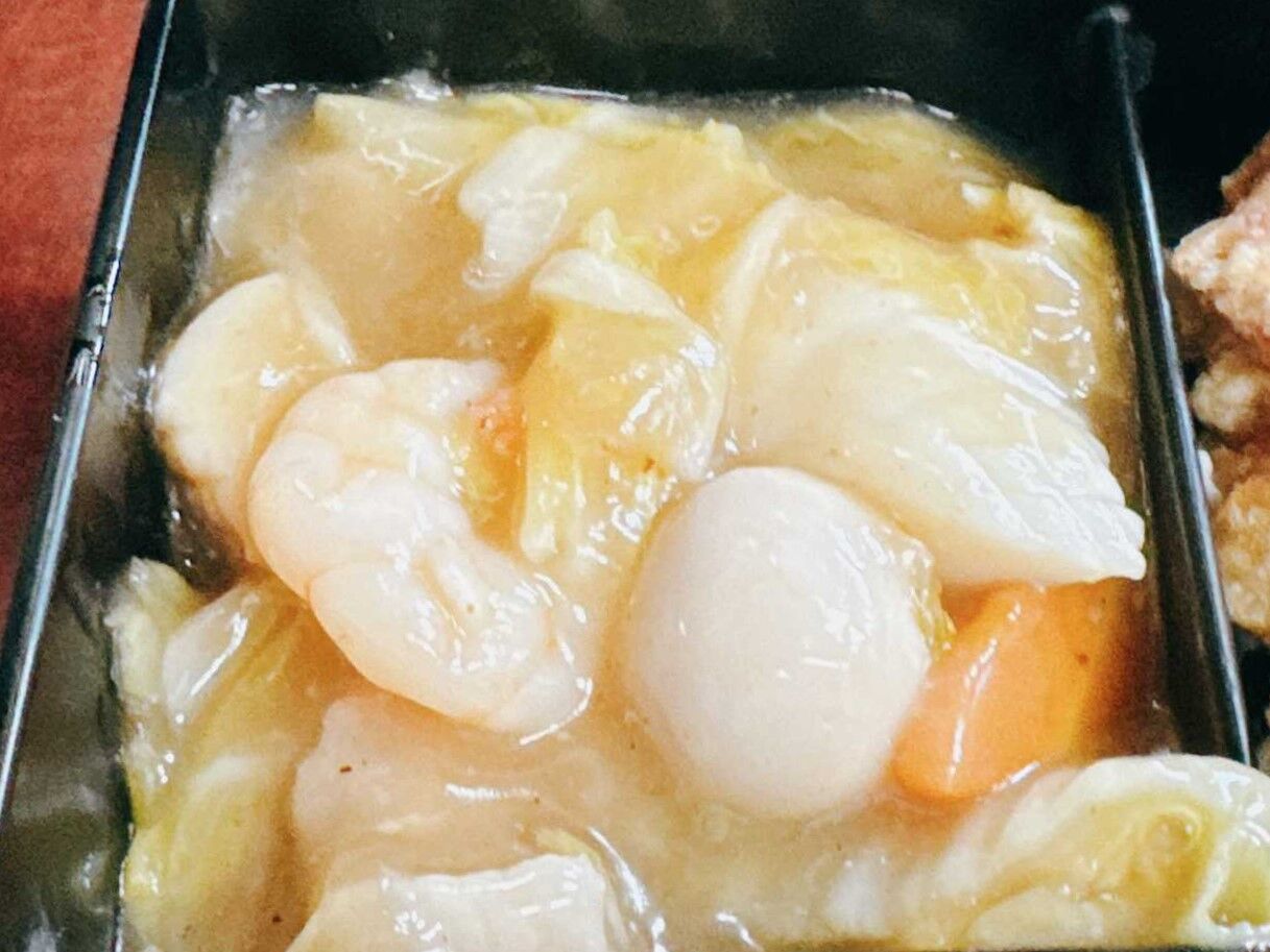 八宝菜は餡の粘度が高くしっかり味付けされています。イカが分厚く食べたえがあります。