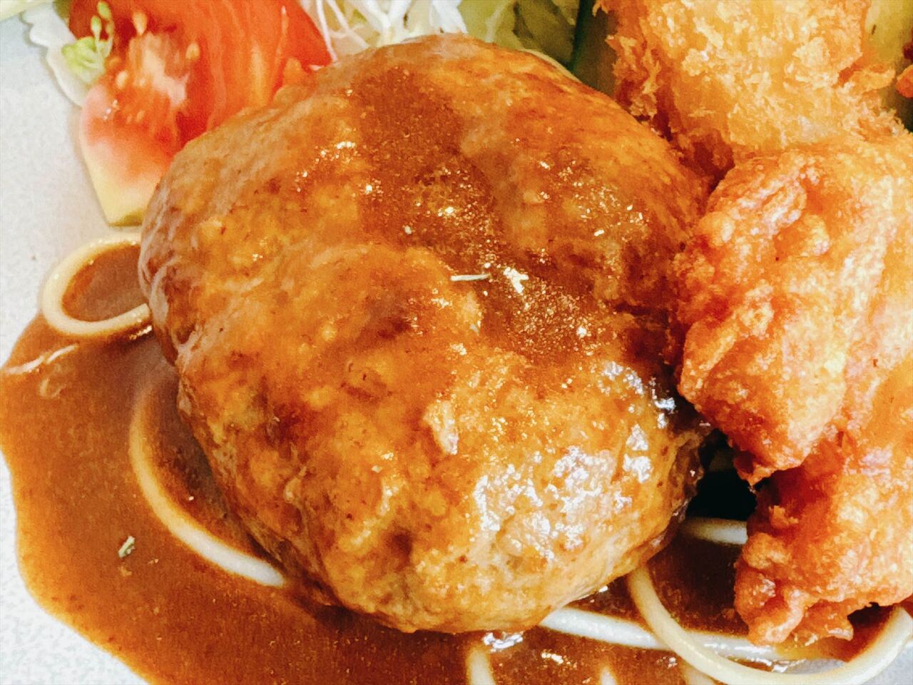 ハンバーグは固めで肉がしっかりしています。デミグラスソースはあっさりタイプです。
