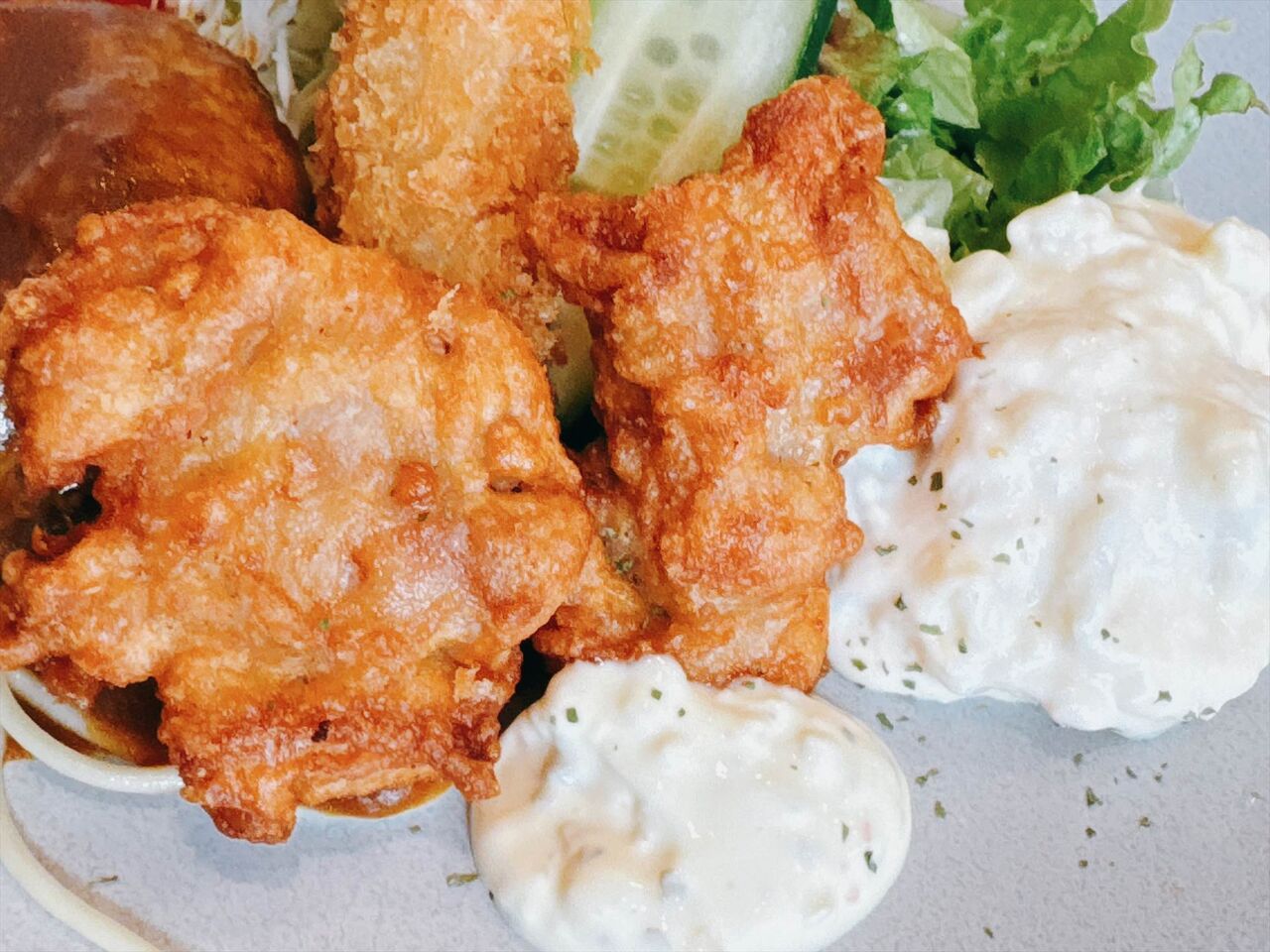 唐揚げは柔らかく味がしっかり付いています。タルタルが2種類あるのかと思いエビフライにつけようとしますが、どうも量が多い方はサラッとしたポテトサラダかもしれません。