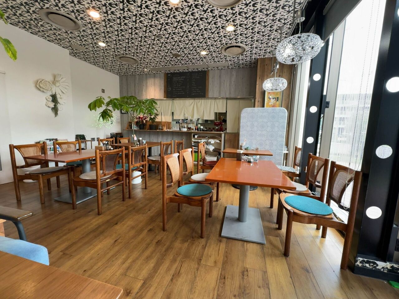 壁全面の大きなガラス窓から光が差し込むおしゃれなスペースにテーブルが並びます。そんなに広くないカフェスペースです。