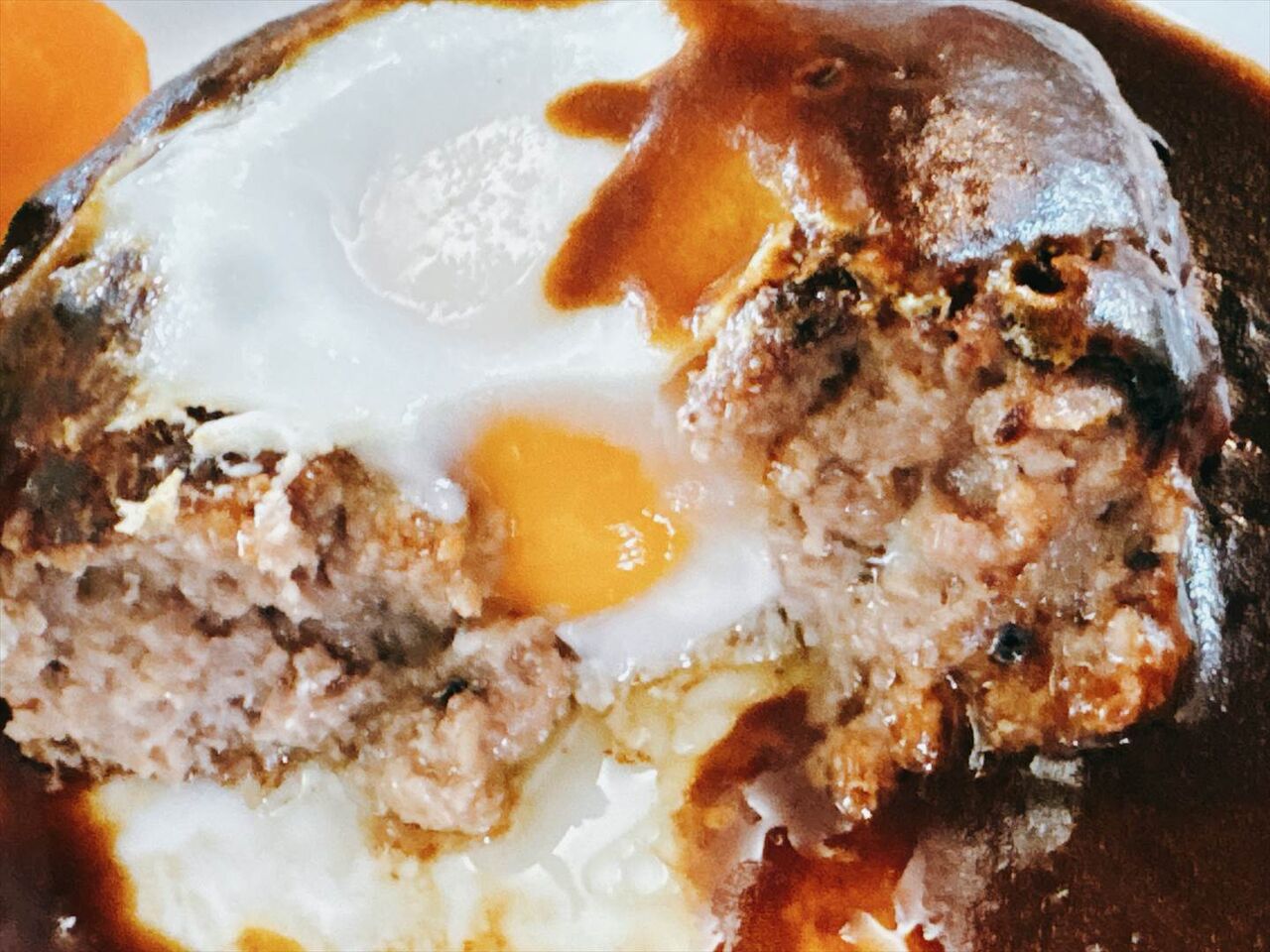 ハンバーグはパテがドーナツ状になっていて中央の穴に卵が入っていて、全体として白身でコーティングされていています。肉汁があふれるタイプで、肉の旨みとデミグラスソースと白身で独特の味わいです。