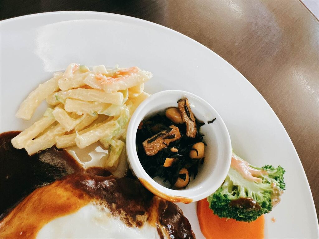 付け合わせにマカロニやニンジンに並んでひじきと純和風料理が添えられています。