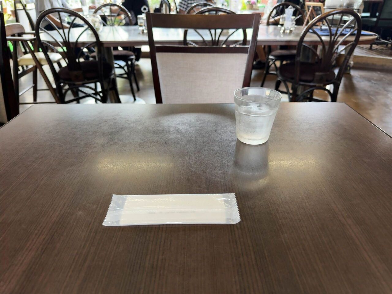 目の前のテーブルはシンプルで他のテーブルにある塩や爪楊枝らしきものがありません。