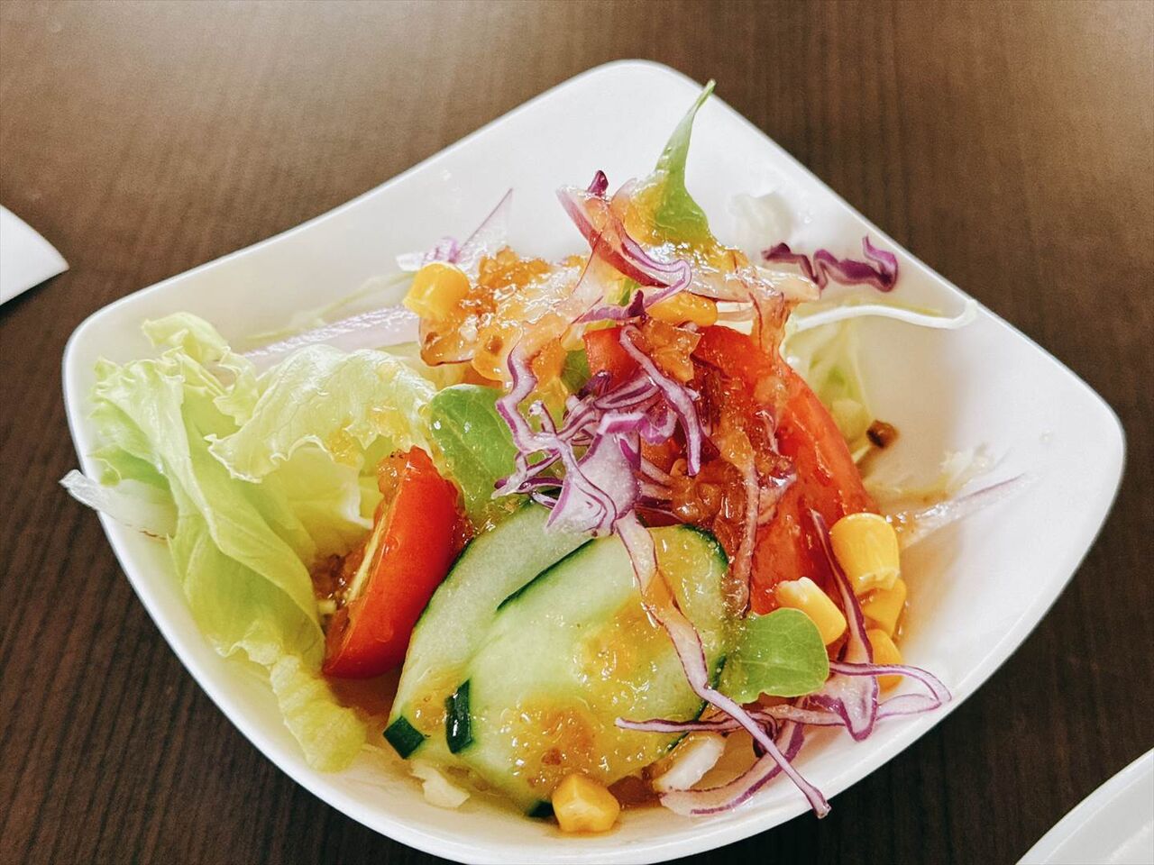 小さいですがカラフルなサラダです。オリジナルでしょうがドレッシングが秀逸です。