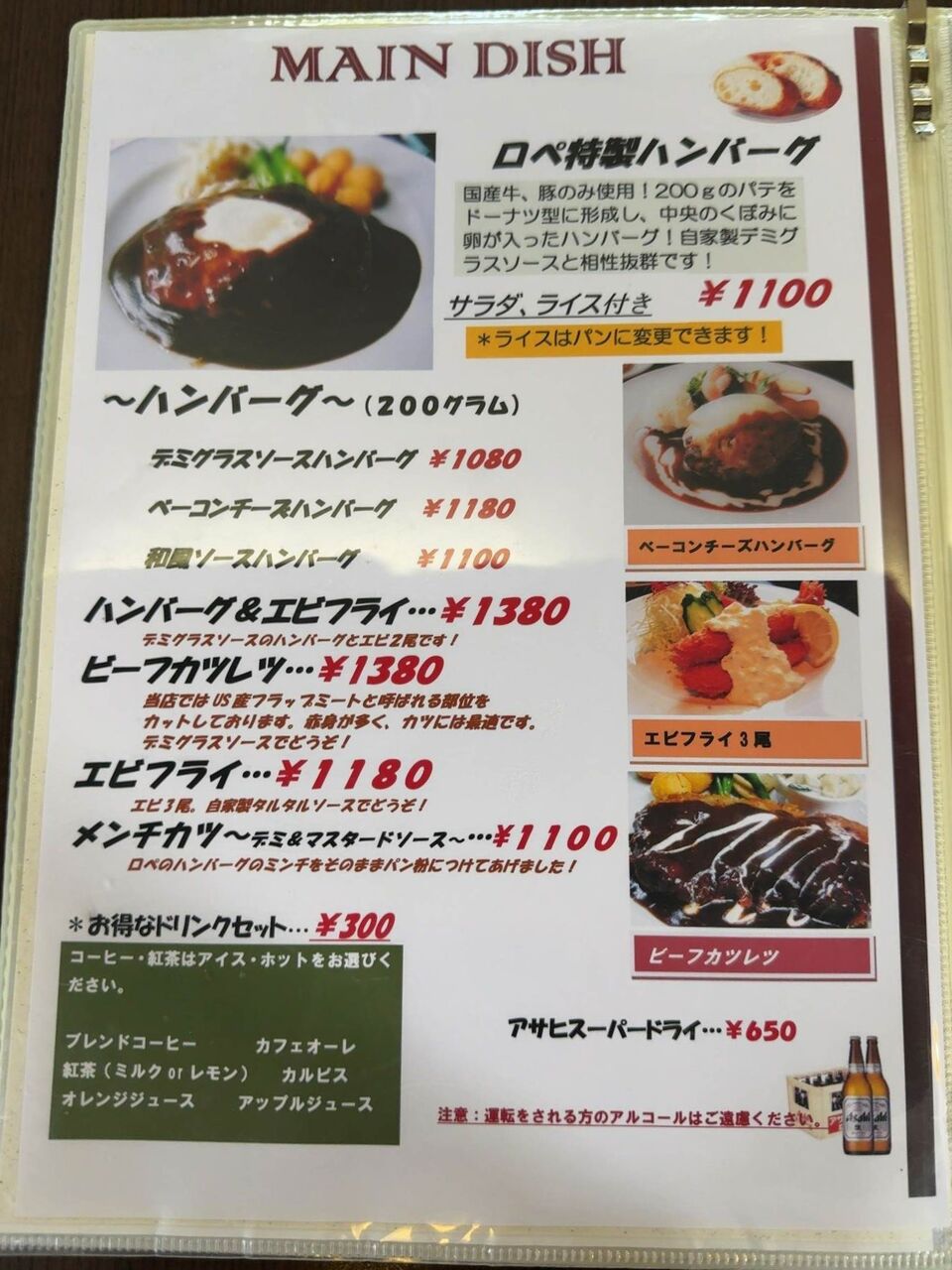 周りを観察すると、エビフライが人気のようです。でも初訪問なので、「ロペ特製ハンバーグ」1100円をオーダーします。