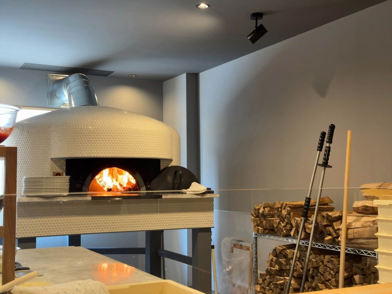 外から見えていたのは本格的なピザ窯です。薪が積まれていてピザを作る工程がすべて見えます。