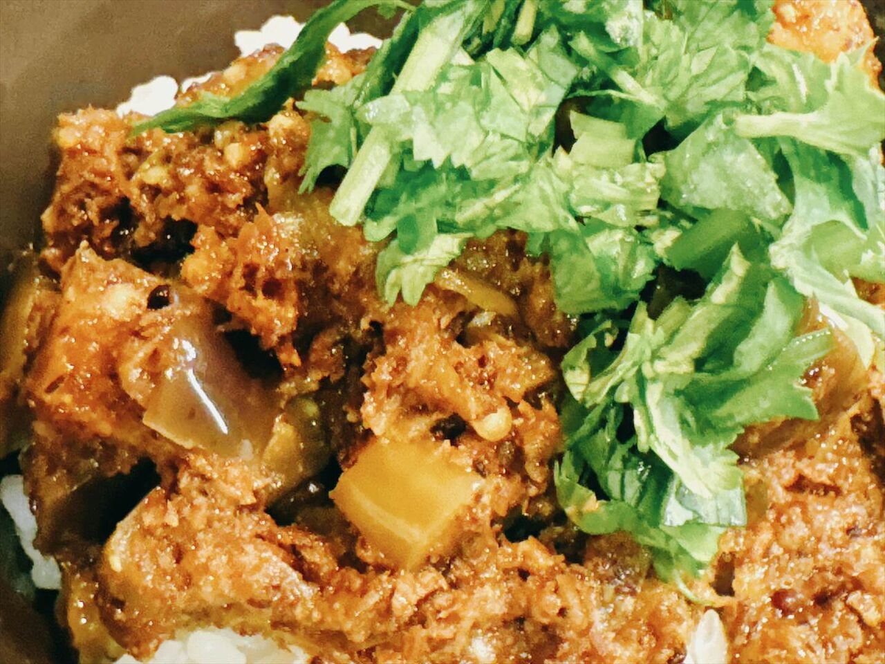 後から出てきたミニ南インド式ナスカレーは小さなお椀にカレーが山盛りになって乗っていてさらにタップリパクチーがトッピングされています。