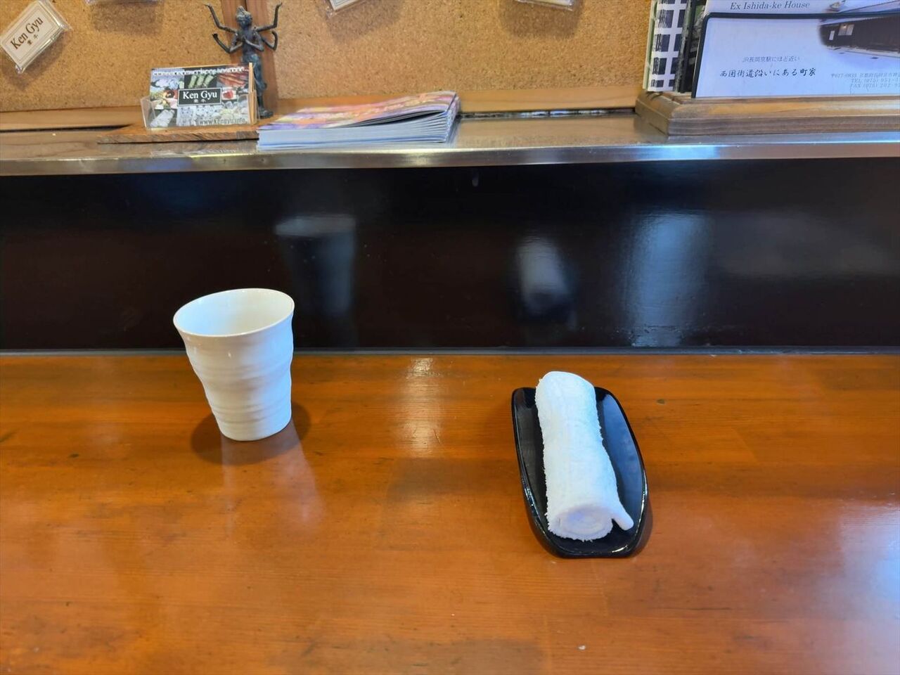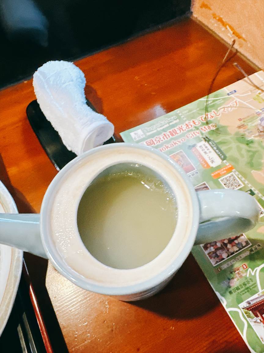 韃靼そば茶ですと、冷たいお茶と上等のおしぼりが出てきます。