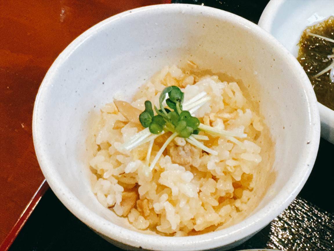 ごはんは、京鶏と筍の炊込み御飯。あっさり味ですが鶏の旨みがしっかりします。