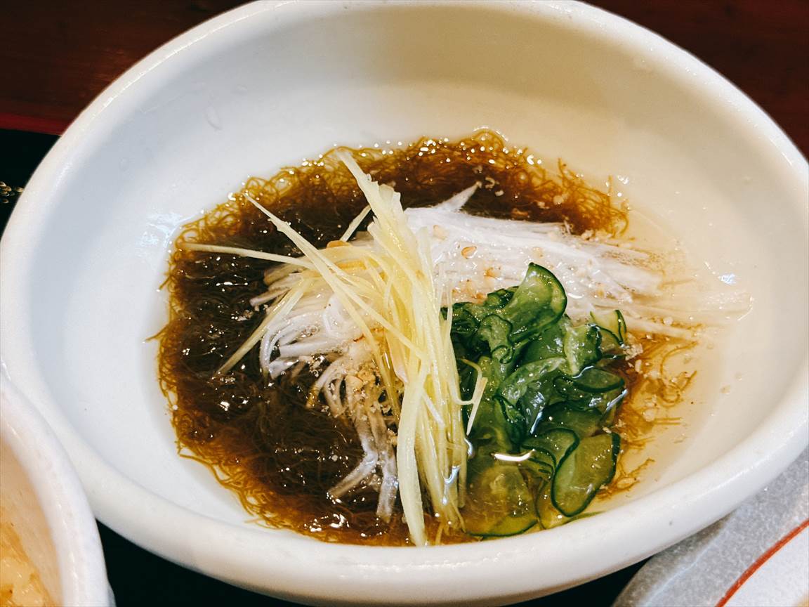 一品は能登の絹もずく酢の物。絹もずくは繊細な食感です。