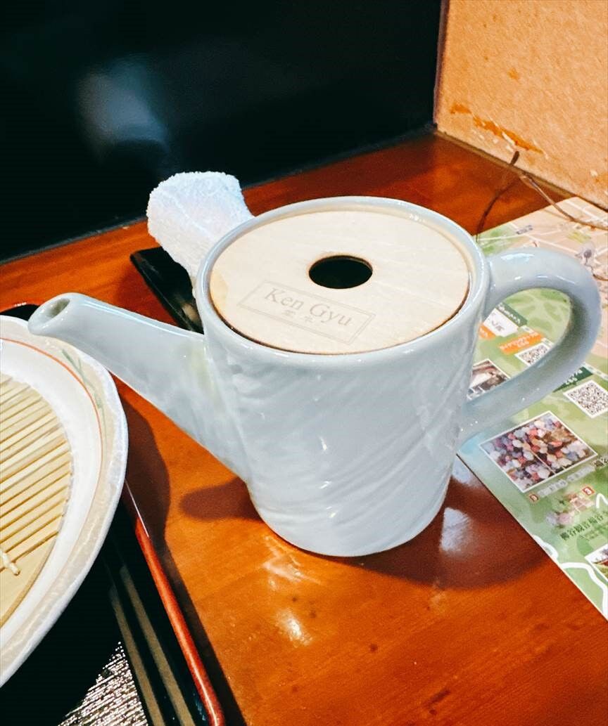 陶器に木の蓋でそば湯が出てきます。