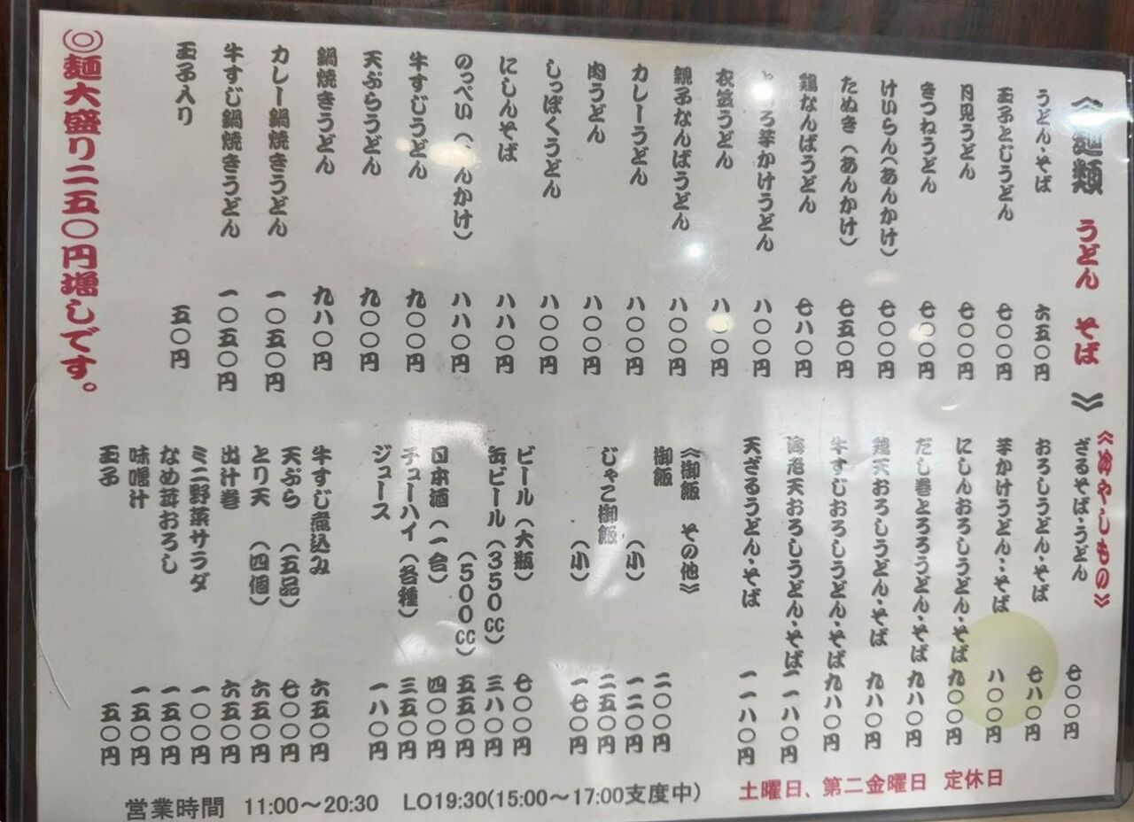 テーブルのメニューを見ると麵類が豊富です。カレー鍋焼きうどんなんかが珍しいです。