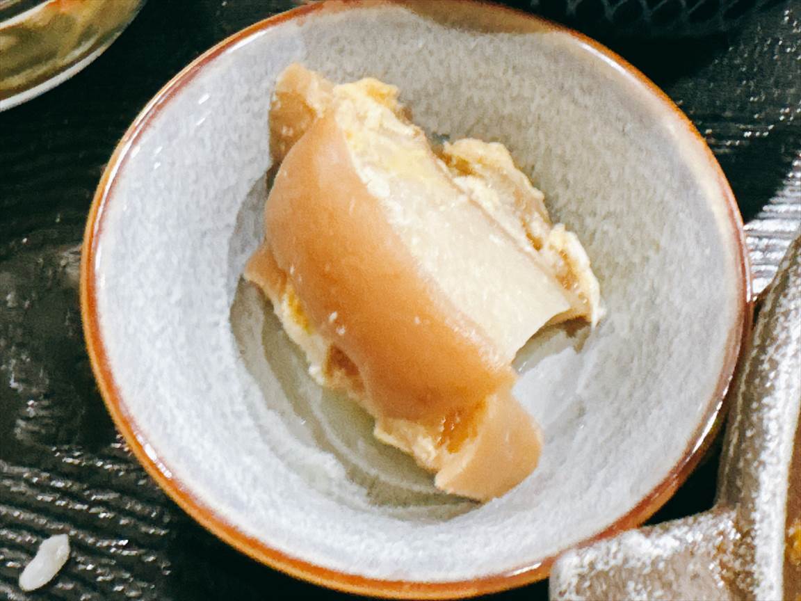 分厚いお麩の煮物は味がしゅんでいます。車麩でしょうか。
