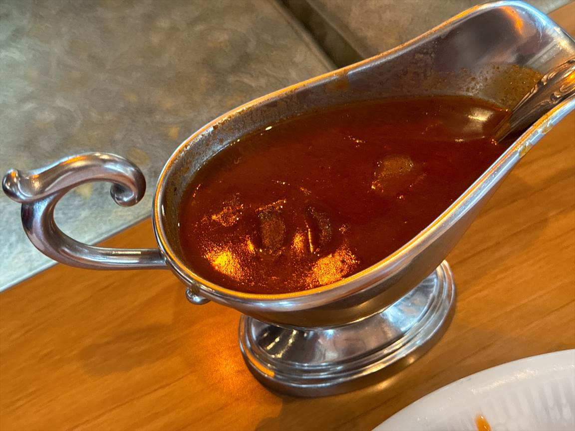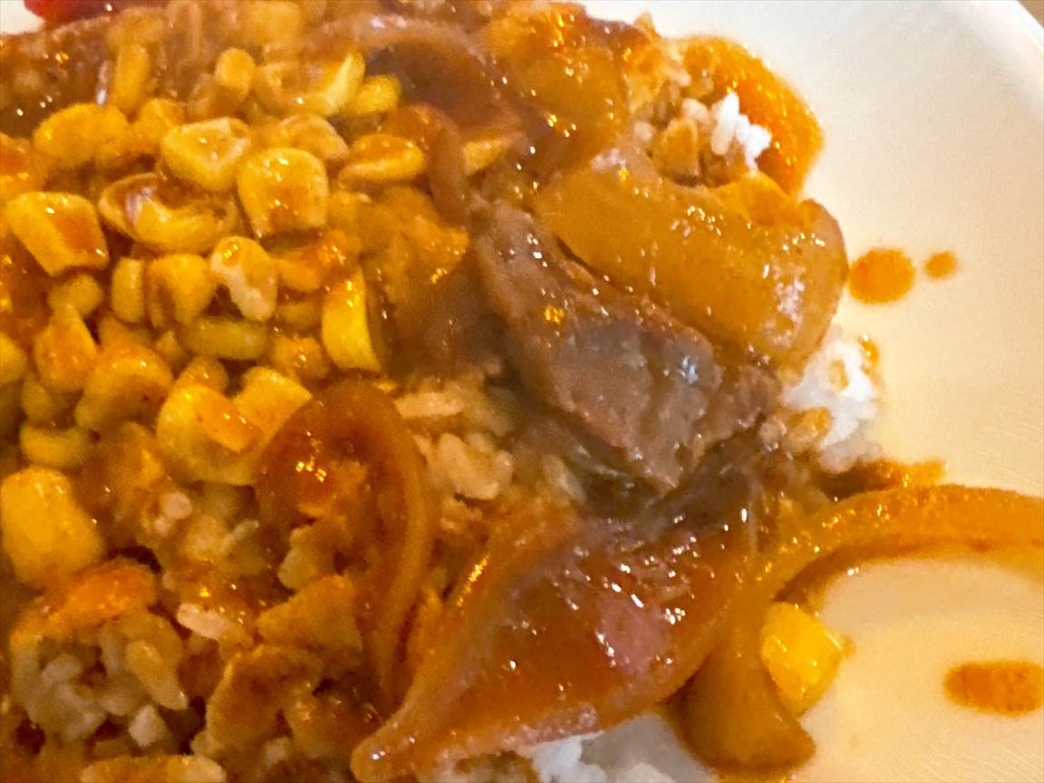 少しずつカレーを掛けて少しご飯が残ってカレーを半分お代わりしたらポットにいっぱい出てきて残してしまったので、一気に掛けてみます。バターで炒めたコーンが甘く刺激的なカレーの辛さとマッチします。シャクシャクした食感もいい感じです。