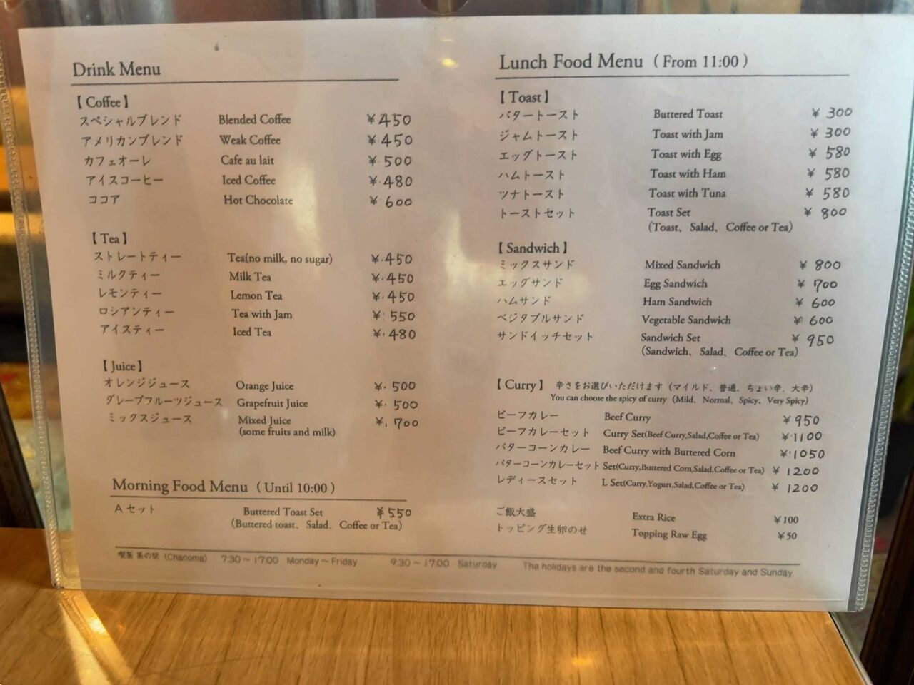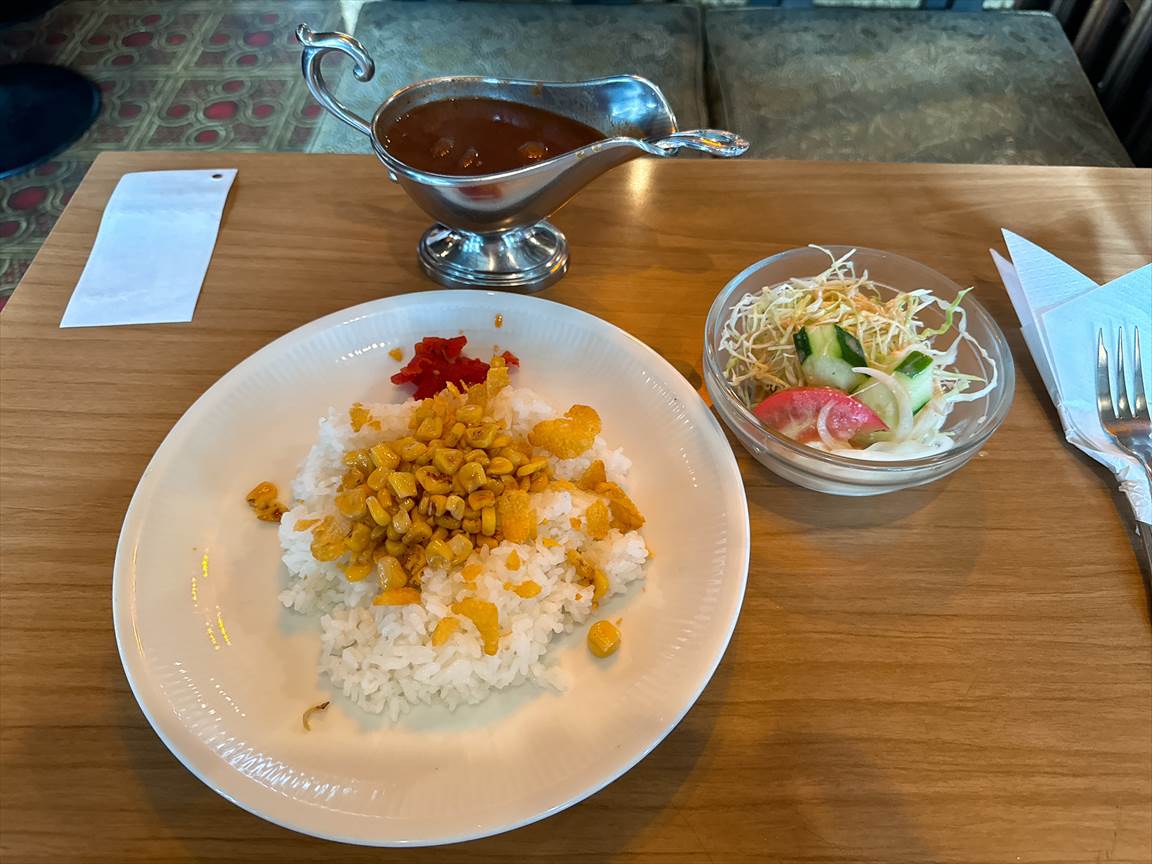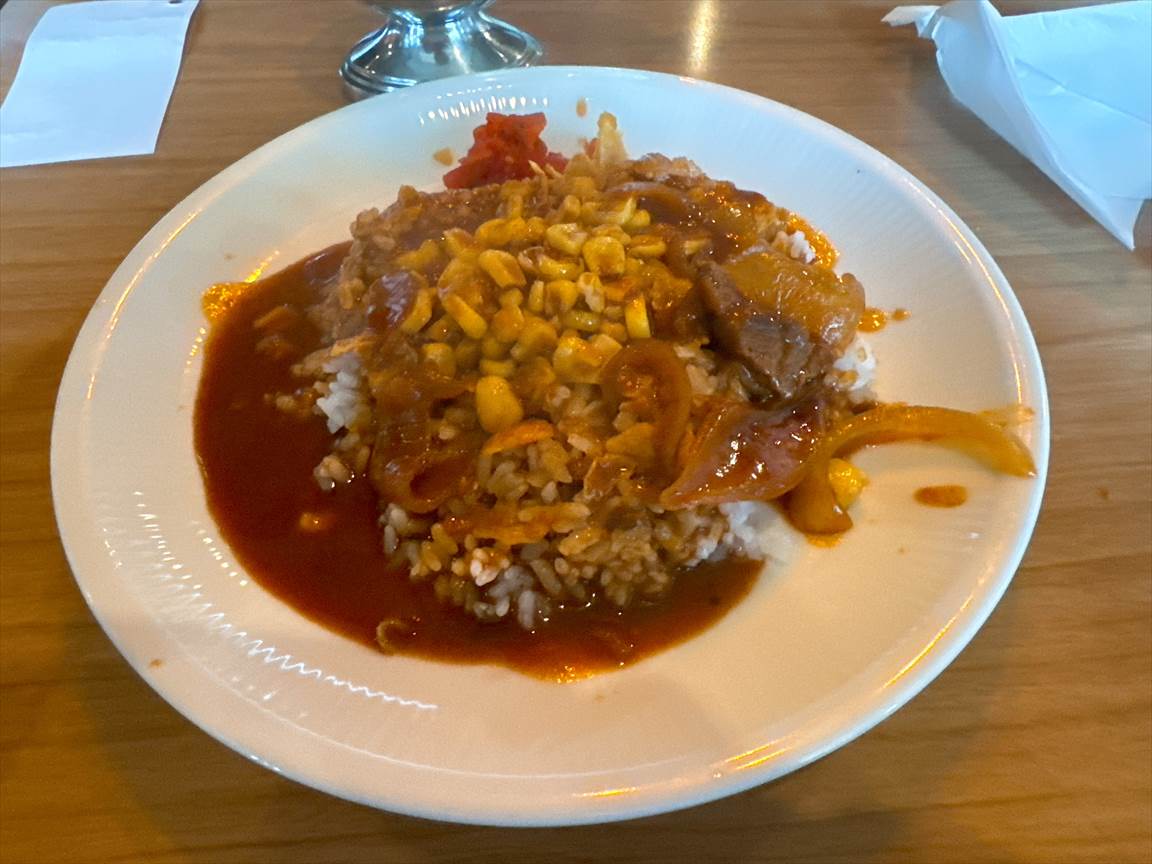 メニューにはトーストやサンドイッチなんかもありますが、やっぱりカレーです。これまで頼んだことのない、「バターコーンカレー」1050円を注文します。