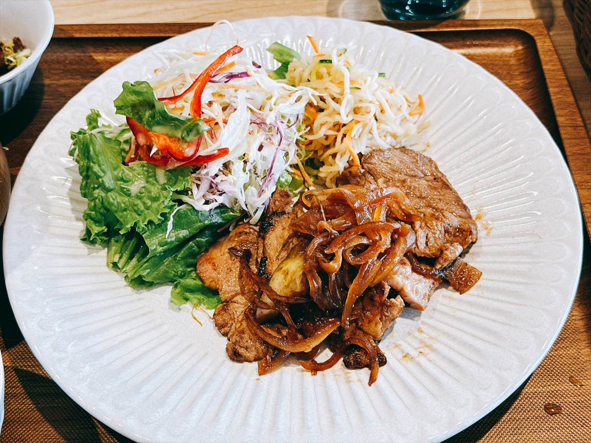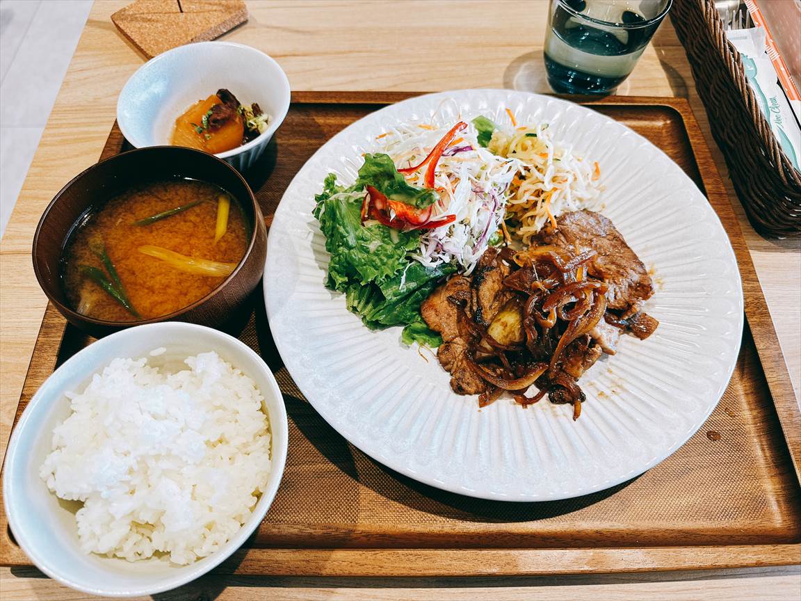 前払いシステムで席に着く前にレジでオーダーします。メニューにはグランドメニューにカレーやパスタなんかがありますが、八百屋のと言う枕詞がつく料理が多いです。八百屋のクロワッサンフルーツサンドなんか反則的に魅力的です。ランチメニューは日替わりで曜日によってメニューが決まっているようです。祝日ですが月曜日ですので、「日替わりランチメニュー(生姜焼き)」950円を注文します。