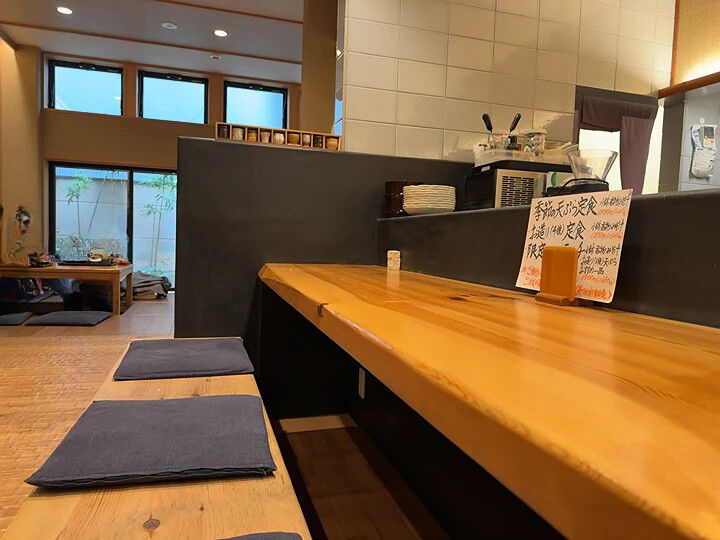 店内は高級日本料理店の雰囲気で、板場の前に掘りごたつ式のカウンターがあって、奥にテーブル席があります。