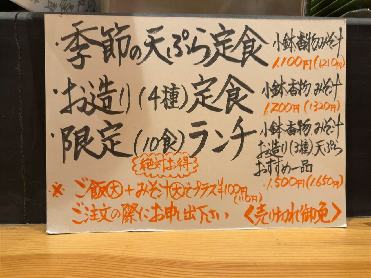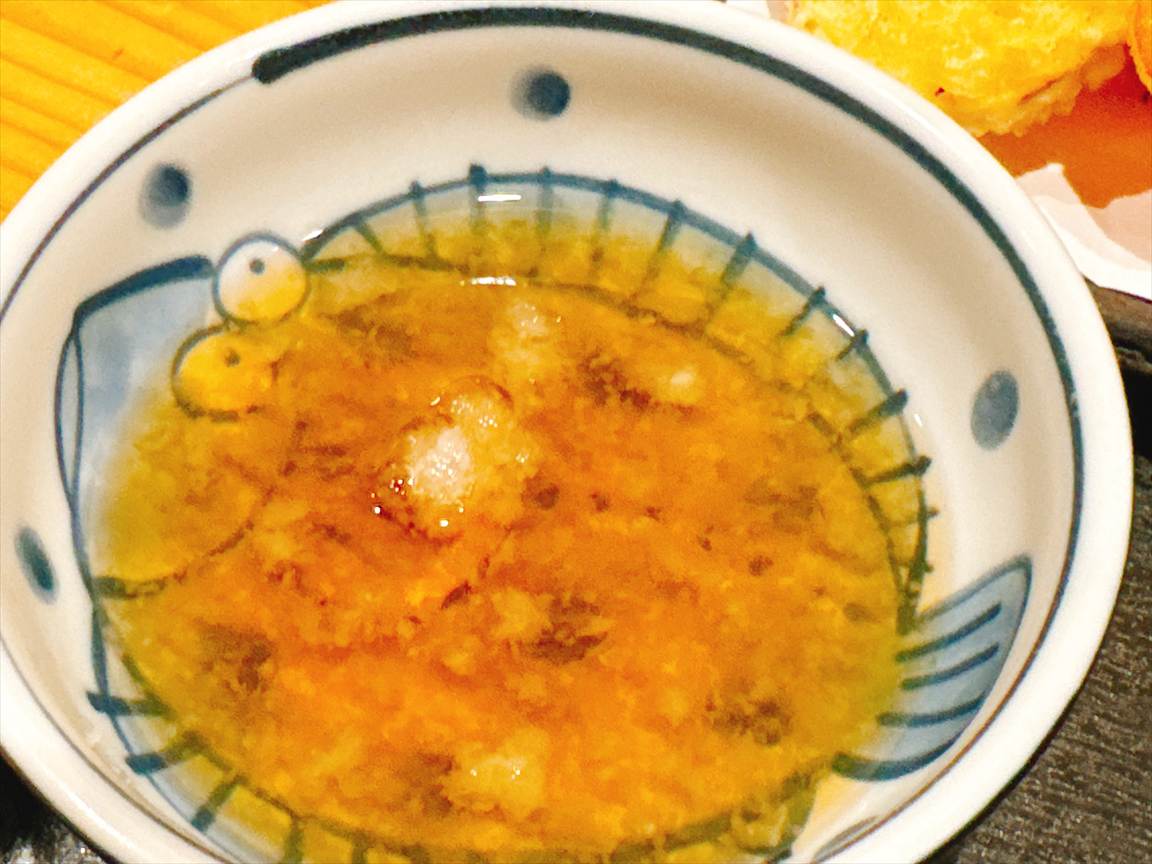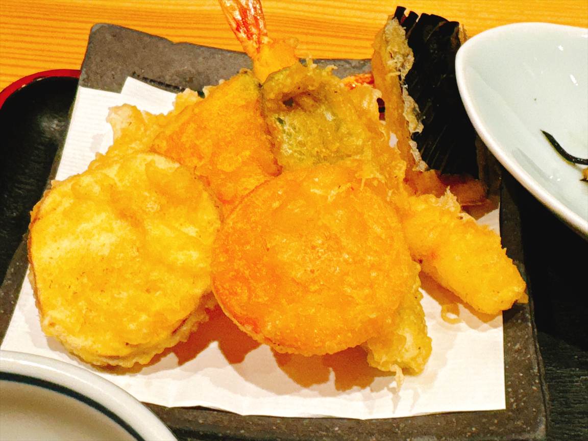 当然天ぷらは揚げたてで全体に衣が薄めです。ニンジン、サツマイモ、ピーマン、カボチャ、ナス、エビと種類が豊富です。しかもエビは2尾も付いています。これだけで天ぷら定食が成立します。