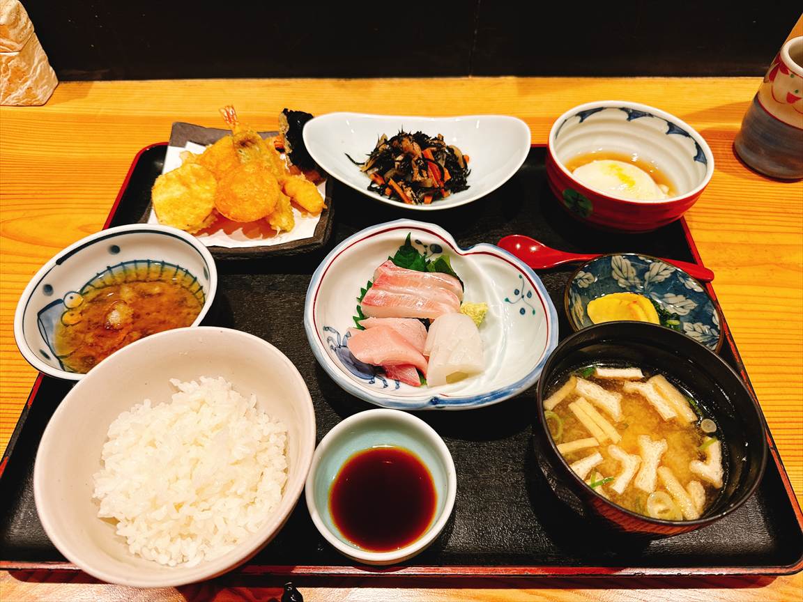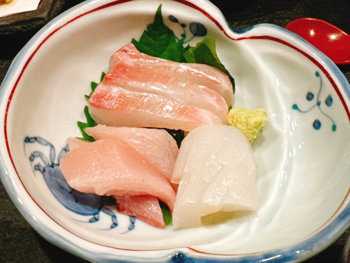 さらにお刺身が付いています。どれも新鮮で脂が乗っていて、イカはコリコリと弾力がありでレベルが高いです。
