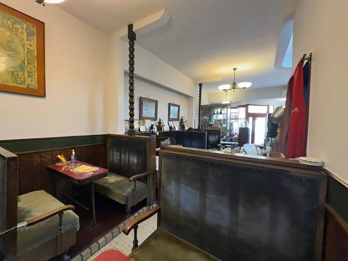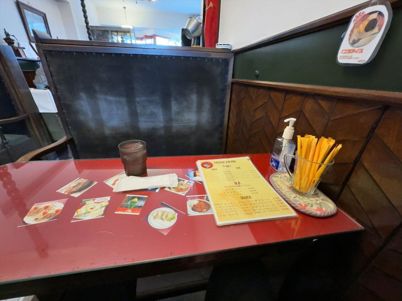 見るからに歴史を感じるソファーや幅の狭いテーブルのボックス席が並びます。