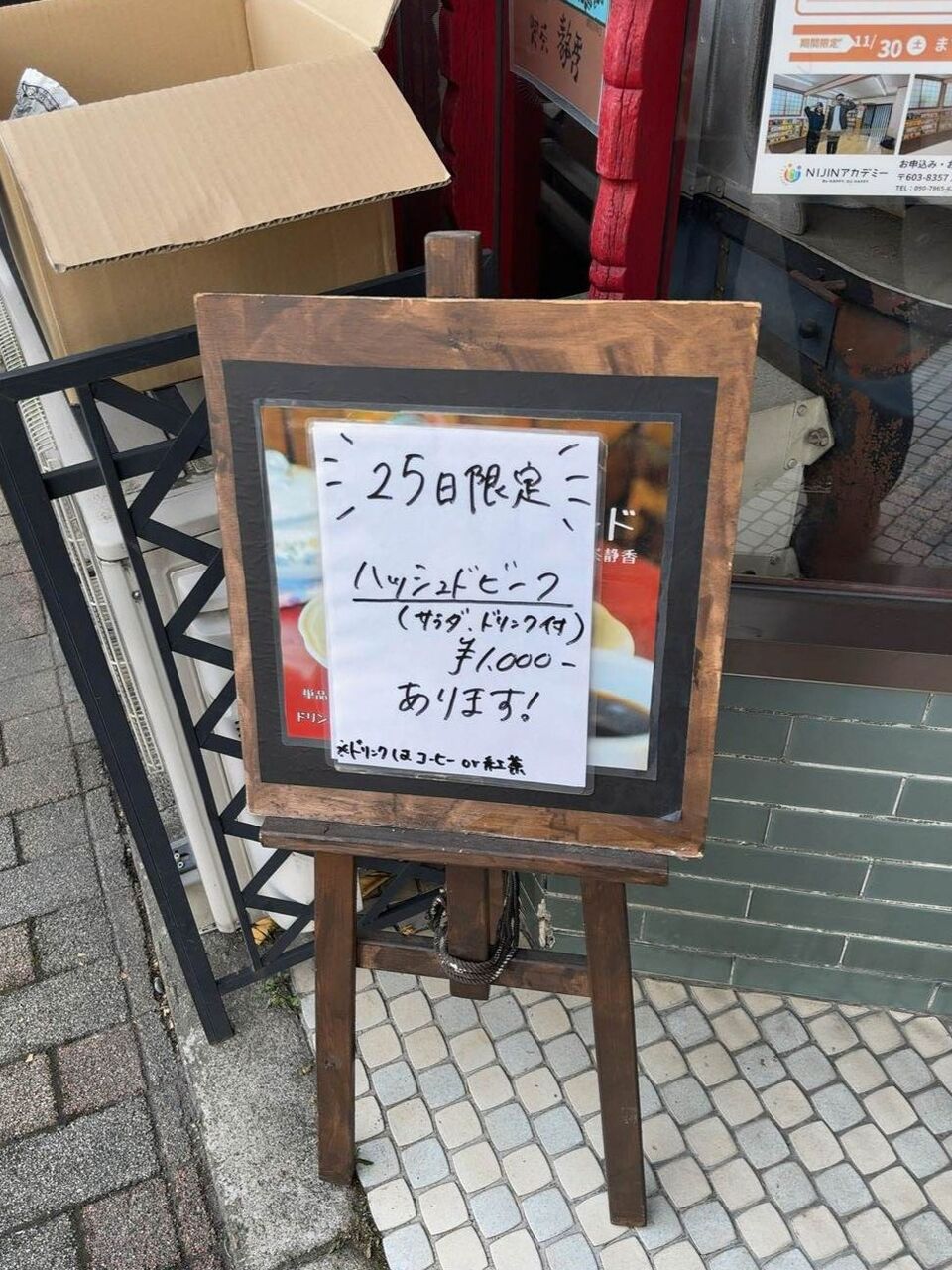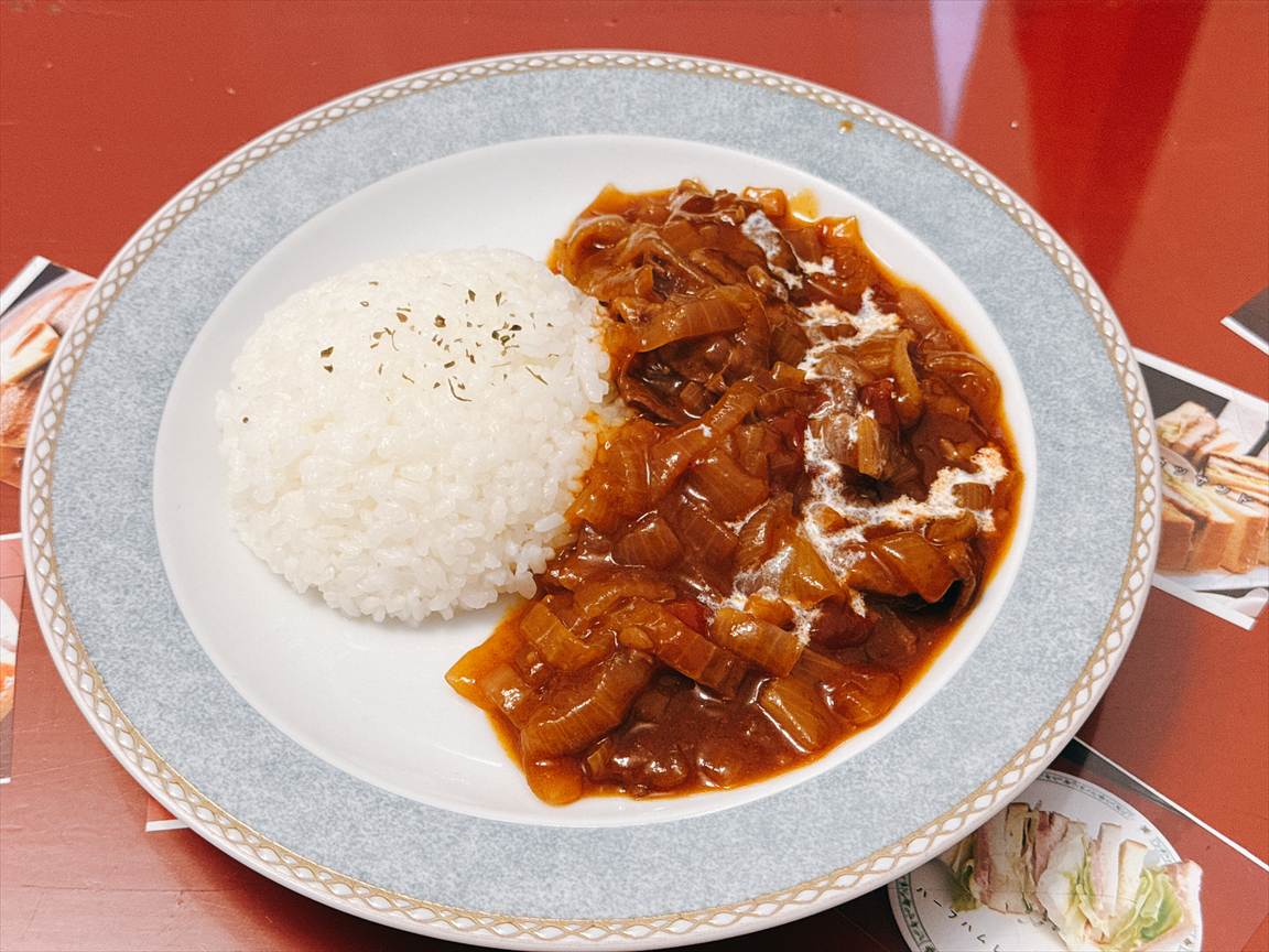 本来なら名物というフルーツサンドを頼むところですが、表にあった25日限定という、「ハッシュドビーフ」1000円を注文します。自動的にドリンクも付いてきます。注文を聞きにくるウェイトレスさんのメイド風のエプロンもレトロです。