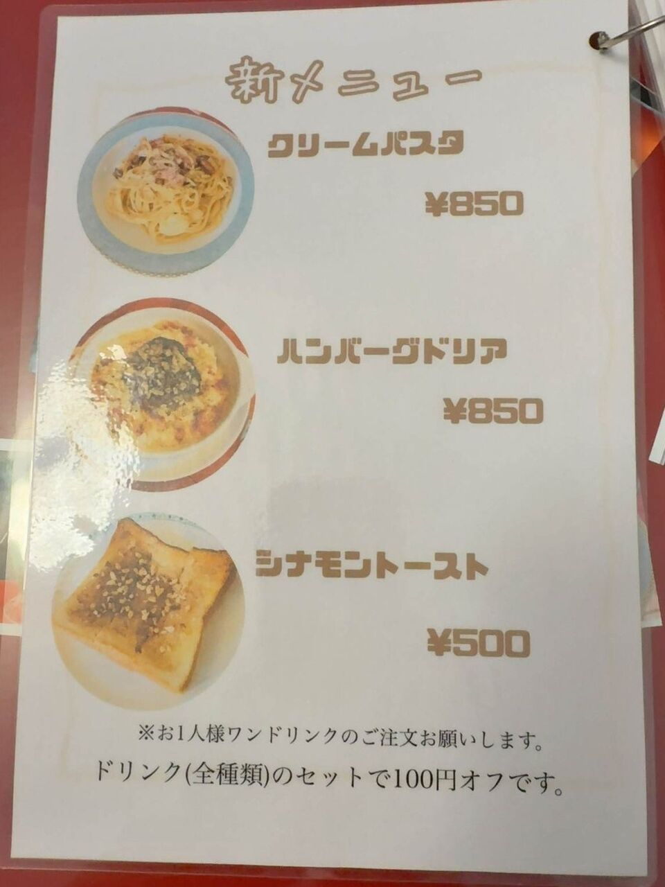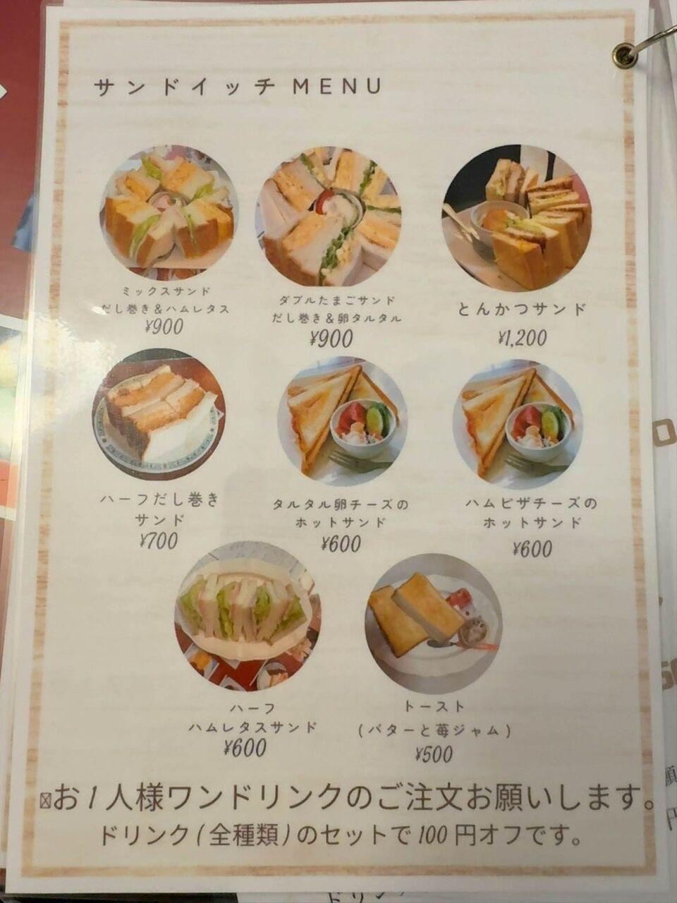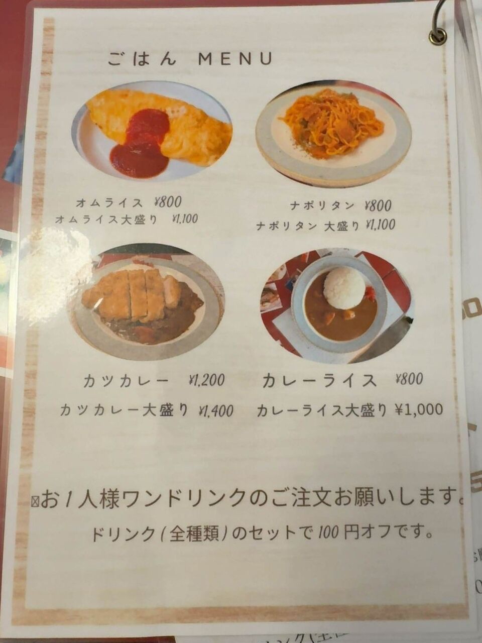 ご飯メニューもいろいろあります。スイーツもフードもドリンクを頼まないといけないルールです。喫茶店を貫いています。