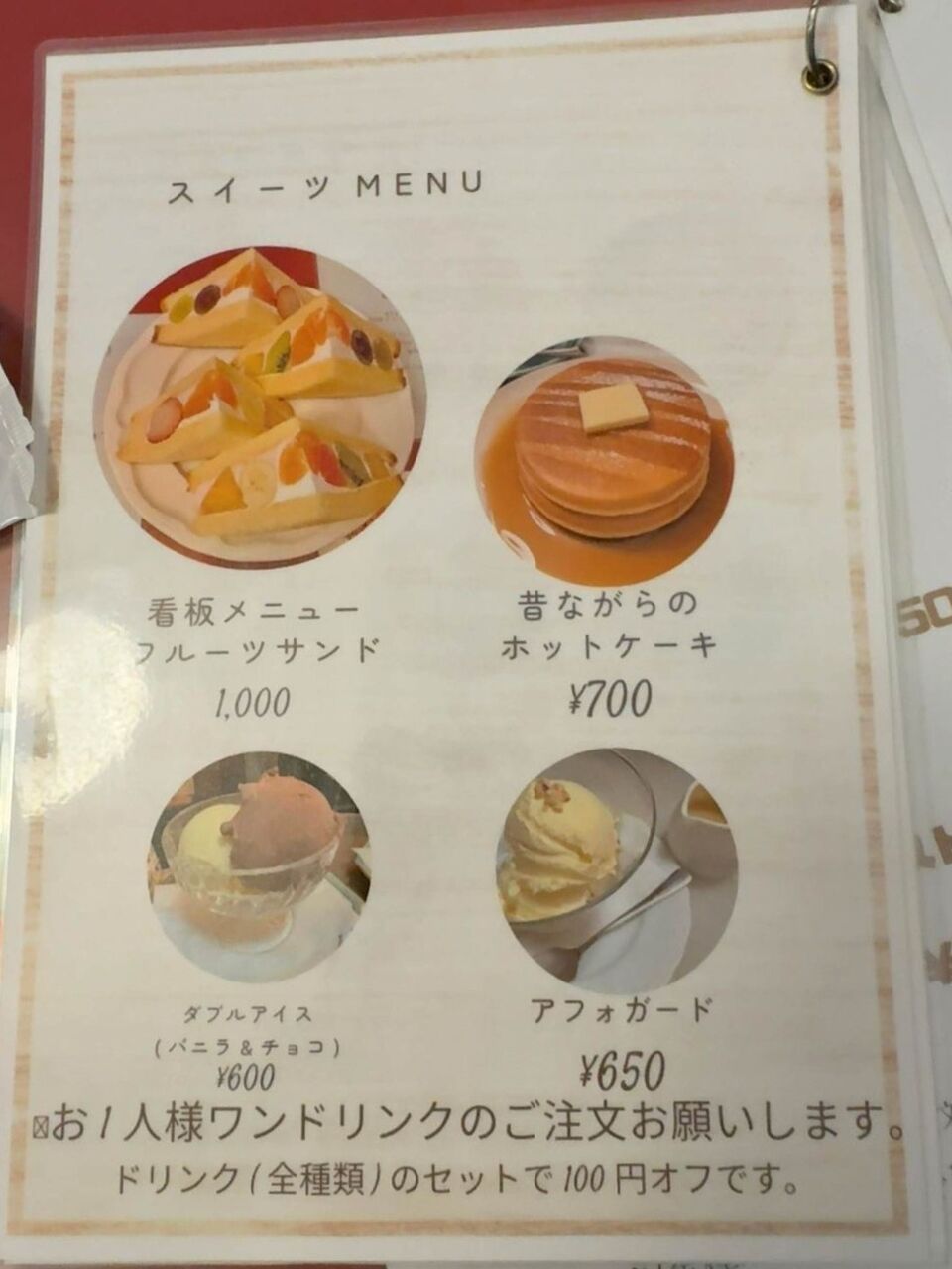 スイーツのメニューもレトロ感がありますが、アフォガードなど新しそうなメニューもあります。