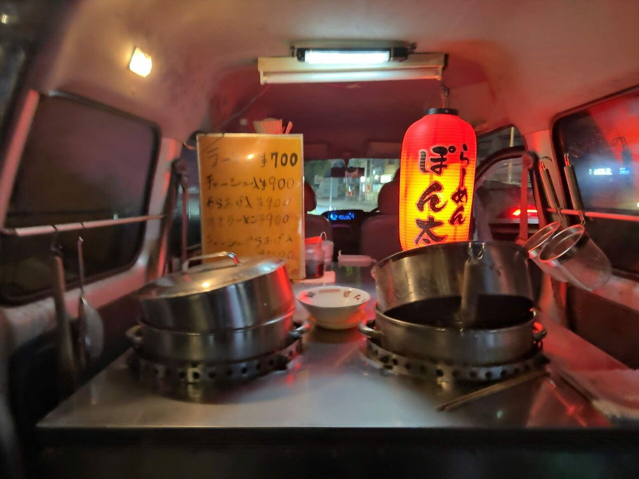 小さな軽のワンボックスで、赤提灯がありますが車の中なので